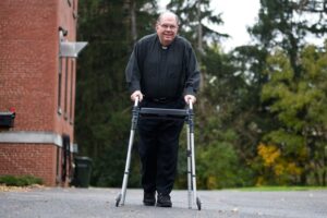 Stepping outside for a brief stroll on a recent chilly morning, the priest carefully placed his walker ahead of him before leaning on it as he advanced his feet one-by-one. It can be challenging, he said, but it gets easier every time he does it.