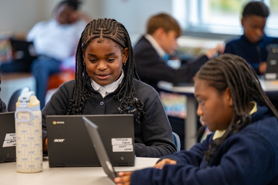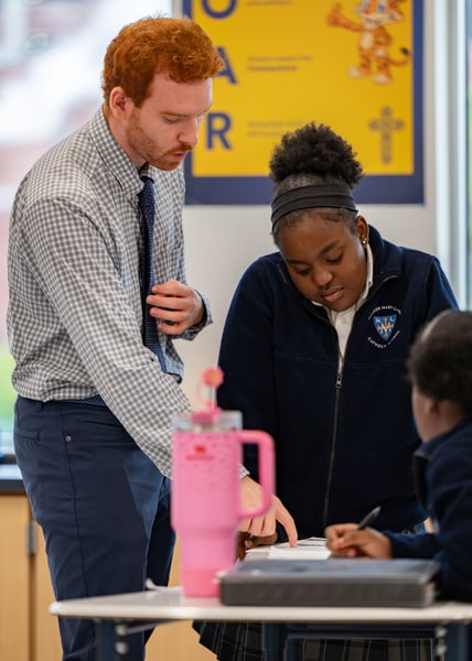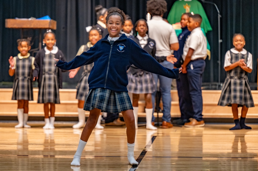 Mother Mary Lange Catholic School thrives, embodying namesake’s legacy in Baltimore education November 3, 2025By Tierra Stone Special to the Catholic Review Filed Under: Feature, Local News, News, Schools The cafeteria buzzed with conversation Sept. 19. Parents, teachers and residents gathered around tables decorated in blue and white, digging into fried catfish, potato salad and cornbread while jazz and R&B played in the background. Rhylie Lane, a sixth grader at Mother Mary Lange Catholic School, works on her laptop during a Sept. 24 study period with classmates in the library. (Kevin J. Parks/CR Staff) The second Family and Friends Day Fish Fry fundraiser was more than a celebration. It was a testament to how far Mother Mary Lange Catholic School has come in four years. When the school opened in 2021 amid a pandemic, it was starting from scratch: a brand-new building, a brand-new staff and a student body drawn from schools across Baltimore. Today, Mother Mary Lange Catholic School stands as a thriving center of learning in West Baltimore, deeply committed to the community and serving nearly 400 students from more than 60 ZIP codes from pre-kindergarten (age 3) through grade eight. From ground zero When Mother Mary Lange Catholic School opened, it was the first new Catholic school built in Baltimore in 60 years. The $24 million, 65,000-square-foot educational complex at 200 N. Martin Luther King Jr. Blvd. in downtown Baltimore was constructed on once-vacant land following a 2019 groundbreaking ceremony that attracted leaders such as Baltimore Mayor Brandon Scott. The new school welcomed students from the former Holy Angels Catholic School and Ss. James and John School as well as others from across the region. Middle school science teacher and STEM program coordinator Dr. Cynthia Tilghman-Lee recalled that the first year brought major challenges, especially after students had endured pandemic-era remote learning elsewhere the previous year. The faculty was new, the students were new and the school was still establishing its policies and procedures. “It was a lot at once,” she said. Despite those difficulties, the school has shown steady growth in enrollment and achievement. It offers competitive academics – particularly in STEM education – with a wide range of extracurricular opportunities. Nate Cannizzo, a math teacher at Mother Mary Lange Catholic School and a University of Notre Dame Alliance for Catholic Education teaching fellow, aids seventh grader Khalia Taylor with a business equation. (Kevin J. Parks/CR Staff) “As of last year, and of course, it changes each year, but last year we had 28 after-school programs and eight of those programs supported STEM initiatives,” said Principal Lynnea Cornish. Tilghman-Lee’s robotics program exemplifies that ambition. “I’ve had big growth last year with our robotics team,” she said. “I have two robotics teams – a younger middle school and an older middle school team. Last year, we competed at the Baltimore City level and we trophied, which was amazing – and one of my other teams made it to the Maryland state level.” The school’s success is reflected not only in academic growth but also in where its graduates continue their education. In the last four years, about 100 students have matriculated into private high schools in the Archdiocese of Baltimore and the Archdiocese of Washington as well as premier public schools in the city and county. “My graduates are at St. Paul, they are at Bryn Mawr, they are at City College, they’re at Western, they’re at Dunbar,” Cornish said. “I have some folks who have gone on to Christian schools, like Mercy High School. We constantly have our alumni coming back.” For graduate Jaylah Golder, who attended Holy Angels from kindergarten through seventh grade before transferring to Mother Lange for her eighth-grade year, the experience was transformative. She remembered playing basketball at Mother Lange in two separate leagues. “We were really working and pushing, and we ended up winning a championship in a tournament that we were invited to, and that stays in my mind constantly because it shows the community that I built within that school,” said Jaylah, now a student at Mercy High School in Baltimore. Deep roots Community engagement has been central to Mother Lange’s mission from the start. Students include those from the surrounding neighborhood as well as families from throughout the Baltimore region and as far away as Pennsylvania. “We marched through the community one year for the fall at the harvest time,” Tilghman-Lee said. “We went and we put notes, stickers and pumpkins on the steps of each of the houses that border our campus.” The school also partners with the University of Maryland and other local institutions that provide educational support. Lyric Caligone, a fifth grader at Mother Mary Lange Catholic School, performs a liturgical dance Sept. 24. (Kevin J. Parks/CR Staff) “During the science fair, I had about 30 judges who volunteer who have built relationships with the University of Maryland, Bio Park,” Tilghman-Lee said. “It was amazing for them to come together and honor our students in such a way that they could converse with them and listen to them explain their projects.” Ashlee Davis, the school’s advancement director, highlighted what makes Mother Lange distinctive. “Our diversity makes us different,” she said. “I would definitely say that we have a melting pot of students and we celebrate all of that as well.” The school also observes both Black History Month and Latin American Heritage Month and maintains a diverse teaching staff. Carrying a legacy Mother Mary Lange Catholic School honors its namesake, Mother Mary Elizabeth Lange, foundress of the Baltimore-based Oblate Sisters of Providence – the first religious order for Black women – and founder of St. Frances Academy in East Baltimore, the first Catholic sc