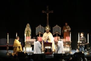The shimmering emotional highlight of Mount 2000, the annual Eucharist-focused retreat for highschoolers at Mount St. Mary’s Seminary in Emmitsburg, is always the Saturday night eucharistic procession at Knott Arena, with a single spotlight illuminating the monstrance.
