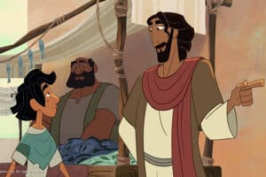 Against this historical backdrop, John — here a well-meaning but impetuous and hot-tempered lad — undergoes a conversion experience once he comes under the influence of Jesus (voice of Ian Hanlin). Becoming one of the Twelve, he witnesses the promised Messiah’s miracles and takes his teaching, some of it conveyed through parables, to heart.