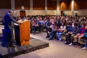 The son of a Pentecostal minister whose Christian faith is an important part of his life, Mukwege participated in a discussion with two student moderators before taking questions from the crowd.