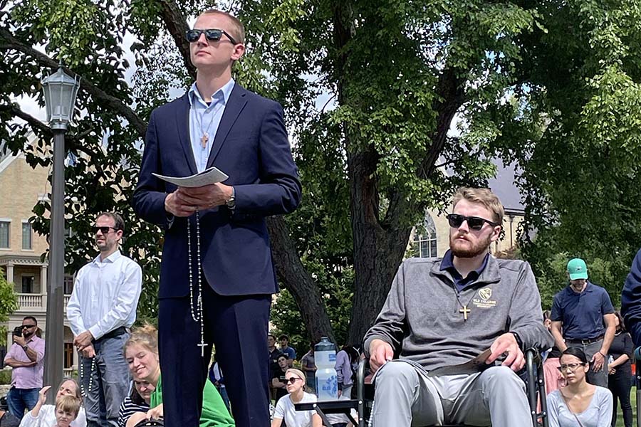 Notre Dame marks 75th anniversary of Father Peyton’s rosary rally, honors his life, ministry September 9, 2025By Catherine Odell OSV News Filed Under: Colleges, Marian Devotion, News, Saints, World News NOTRE DAME, Ind. (OSV News) — On Sept. 7, a crowd assembled outdoors on the campus of the University of Notre Dame, near the steps of Bond Hall. In recent years on home football game weekends, the university’s marching band performs on these steps before heading to the stadium for the game. But on this sunny Sunday afternoon, the gathering had nothing to do with football. Catholics from the South Bend area as well as students and university officials from three local Holy Cross institutions of higher learning, came together to pray the rosary. They also came to celebrate the life and ministry of Father Patrick Peyton (1909-1992), a Holy Cross priest, a Notre Dame graduate and sainthood candidate named “Venerable” in 2017. Young men pray the rosary at a rosary rally held at the University of Notre Dame in Indiana Sept. 7, 2025. Catholics gathered to pray the rosary and celebrate the life and ministry of Father Patrick Peyton, a Holy Cross priest and a Notre Dame graduate named “Venerable” in 2017 who encouraged families to pray the Rosary together. (OSV News photo/Gretchen R. Crowe) Seventy-five years earlier, Father Peyton had led a much larger outdoor rosary rally on this campus. On Sunday, Oct. 22, 1950, more than 22,000 people processed across campus into the football stadium for the rally. That day, according to the South Bend Tribune, Father Peyton, then 41, told the crowd: “We do not ask for family prayer to put a burden on men and women, but to bring happiness and peace to them.” He told the stadium crowd that family prayer was the best way to strengthen home life. For many years, Father Peyton had been urging families all around the world to pray together, and particularly, to pray the rosary together. “The family that prays together stays together” became the saying closely connected to his ministry. And, in the late 1940s and even in 1950, he believed that many families around the world were still deeply wounded by the global trauma and destruction that followed World War II. Father Peyton’s rosary mission had earned him the label of “Rosary Priest” and began in Albany, New York, soon after his ordination in 1941. In New York, he founded the Family Rosary Crusade and was incredibly successful in harnessing the media — radio and television — to help promote the Gospel and prayer. Father Peyton later recruited many Hollywood movie stars — including Loretta Young, Jimmy Stewart, Grace Kelly and Jack Benny — to help him promote that message about the need for prayer. In fact, two years before his 1950 homecoming rally at Notre Dame, Father Peyton had led a Rosary Crusade in London, Ontario. It was the first of 540 rallies held around the world during Father Peyton’s lifetime. This 1948 Canadian rally was phenomenally successful. 80,000 families — 95% of the London Diocese — promised after the rally to faithfully pray the family rosary. Father Peyton had been deeply committed to the rosary since his childhood days at home in County Mayo, Ireland. There, his mother gathered the family each night for the rosary, which his father led. When he and his brother Thomas followed older siblings to the United States and eventually in 1929 to the Holy Cross seminary at Notre Dame, Patrick believed that God was preparing him for a priestly ministry in the order’s foreign missions. But he suffered a nearly fatal bout with tuberculosis while at The Catholic University of America seminary in Washington. He experienced a healing which he and others saw as “miraculous” and attributed to the intercession of Mary. However, by the time of his ordination in 1941, Father Peyton’s superiors still did not feel that he was physically strong enough to serve in the foreign missions. The young priest accepted their judgment gracefully. Within a few years, however, he’d seen that there was a different way he could be a missionary. This ministry, the Family Rosary Ministry, took him and the rosary all around the world. “So, why are we all here today?” began Holy Cross Father Peter McCormick, Notre Dame’s assistant vice president for campus ministry in welcoming the crowd and as Notre Dame’s 2025 rosary rally began near Bond Hall. Father McCormick acknowledged that the Holy Cross community and the University of Notre Dame certainly wished to honor Father Peyton on this 75th anniversary of his Notre Dame rosary rally. Father McCormick pointed out that Father Peyton’s ministry had touched more than 28 million people around the world. “But Father Peyton,” he said, “would not want today’s spotlight to be on him. He would say that it should be on the mother of God who has gathered us here.” The event was sponsored by Holy Cross Family Ministries, founded by Father Peyton and based in North Easton, Massachusetts. It was also livestreamed for interested viewers across the country and then made available on YouTube. Father McCormick then introduced the rally’s keynote speaker, Alex Jones, CEO and co-founder of the Hallow App, an American Catholic meditation and prayer app. Jones, a 2015 Notre Dame graduate, told the crowd about his own faith journey, a journey that began with bleak assumptions about prayer. “I used to think,” he told the crowd, “that prayer was just going through the motions — asking God for things, complaining about things, repeating the things I’d memorized as a kid. I later learned that prayer is just about love. It’s about sitting and letting the Lord love you and fill you with his love so that you really have no choice but to go and share it with the world.” That transition to recognizing and rejoicing in God’s love took him some time, Jones admitted. He’d lost his faith as a teenager. A spiritual director hel