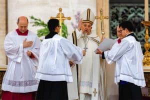 Through his resurrection, Jesus opens “those doors that continually we shut with the wars spreading throughout the world,” he said after celebrating Easter Mass in St. Peter’s Square March 31. “Only the risen Christ, by granting us the forgiveness of our sins, opens the way for a renewed world.”