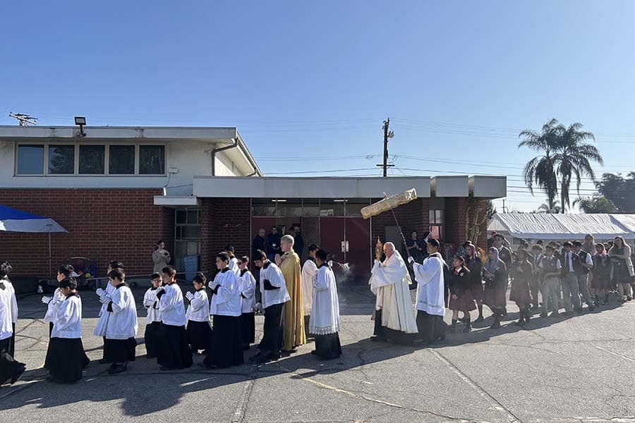 One day after desecration, California school holds reparation Mass February 4, 2026By Mike Cisneros Angelus Filed Under: News, Schools, World News LONG BEACH, Calif. (OSV News) — When Principal Cyril Cruz arrived at Holy Innocents School in Long Beach early on the morning of Feb. 2, she discovered a scene of “desecration”: trash, food, several Virgin Mary statues broken and Catholic missal books spilled onto the floor. The tabernacle was significantly damaged. Since the discovery, the Department of Justice’s Civil Rights Division announced that it will “open an investigation into this awful crime.” But 24 hours later, students, staff, parents, and community members were back in the cleaned-up space on Feb. 3 to celebrate a Mass of reparation. Bishop Marc Trudeau, the auxiliary bishop for the Archdiocese of Los Angeles’ San Pedro Pastoral Region, began the Mass by blessing the altar and surrounding space with holy water. Following the Mass, Father Peter Irving III, the longtime pastor at Holy Innocents Church, led a Eucharistic procession on the streets and alleyways surrounding the school. Father Robert McGowan, wearing gold vestments, associate pastor at Holy Innocents Church, and Father Peter Irving III, the pastor at Holy Innocents, holding the monstrance, lead a Eucharistic procession through the streets around Holy Innocents School in Long Beach, Calif., Feb. 3, 2026, one day after the school was discovered vandalized and ransacked. (OSV News photo/Mike Cisneros, courtesy Angelus News) “People who are broken tend to break things,” Trudeau said during the homily. “And healing is necessary. We can’t look at them or demonize them as terrible people. “Because God sees us all as his children, worthy of redemption, worthy of mercy. So we call on our Blessed Mother to help us to be like her Son, bringing healing and forgiveness to all who need it.” That a Mass was being held at all in the school hall was a miracle considering what school officials had seen the day before. When Cruz arrived at the school on the day she discovered the vandalism, she noticed a side door open in the hall where daily Mass is held every morning. She sent her son to close the door, but then he told her what he found. First, all they saw was trash, with chips and soda cans spilled out. As they looked further, it got much worse. Audio equipment, lighting, and musical instruments were damaged. Virgin Mary statues — including a life-size replica that had been at the school since its opening in 1958 — were shattered or dismembered. The bronze tabernacle holding the Eucharist was thrown to the floor, broken. And so much more that couldn’t be fully comprehended. That’s when Cruz called Irving, teachers, and staff, letting them know that they weren’t going to be able to have Mass that morning. Then she called the police. Kiernan Fiore, the director of academics at Holy Innocents, walked through the campus to make sure there were no longer any threats. Then, teachers and staff got to work on helping the students process what happened — with the help of prayer. They organized a rosary walk through campus, while several other classrooms were already on their knees in prayer. Some kids were sad. Some were angry. But what was emphasized to students was how to respond when bad things happen. “What happened here happens because there’s darkness inside someone that they’re carrying with them,” Fiore said she told students. “We don’t know who they are, what their story is, but you have the choice to not carry that kind of darkness, and instead to carry light. You can turn to our Lord right now.” When the school day ended and the police had finished gathering evidence, the outpouring of assistance and offers of help shocked even those who are used to their supportive community. Principal friends reached out to Cruz to ask what she needed. Alumni contacted the school to ask how they could help. A GoFundMe was set up that has raised more than $100,000 so far. Parents stopped by with offers to clean. And so they went to work, cleaning up the gigantic mess. Irving salvaged the hosts in the damaged tabernacle. “Do you think we can have Mass tomorrow?” someone asked. Hours later, what was unthinkable earlier in the day was somehow made possible: the hall was clean, chairs returned, kneelers restored. It wasn’t perfect — things were still missing or damaged — but there would be a Mass the next morning. Students filed into the newly cleaned hall in their red-and-black uniforms for the reparation Mass, before participating in the Eucharistic procession. Now, school leaders say, it’s important to turn the horrific event into an opportunity to solidify their faith. “It’s like, truly embrace your cross,” Cruz said. “This is what we do at Holy Innocents. I call it a modern-day martyrdom. And what we really try to teach the kids here is that we want them to be truly good citizens, obviously of the world, but of heaven and their witness. I was telling them, it’s just so beautiful to cling to faith, to pray for the healing of these people.” “The upsetting thing is this is a school,” Trudeau said. “It upsets the lives of the children. They feel violated. That’s why we wanted to get back to their normal schedule, their normal routine as soon as possible. “It takes time to desecrate a place, but God’s blessing is more powerful than that.” Donations to the school can be made at lbcatholicschool.com, or this GoFundMe page. Read More Schools Loyola University offers teens a mission-driven approach at business camp Chesterton Schools Network aims to add 22 schools worldwide this year Maryvale roars past Mercy for second straight ‘Classic’ triumph From church choir to curtain call for Archbishop Borders School graduate Melissa Victor Science teacher honors Challenger crew’s memory by encouraging curiosity, resilience, faith ‘With joy,’ Dominican fulfills m
