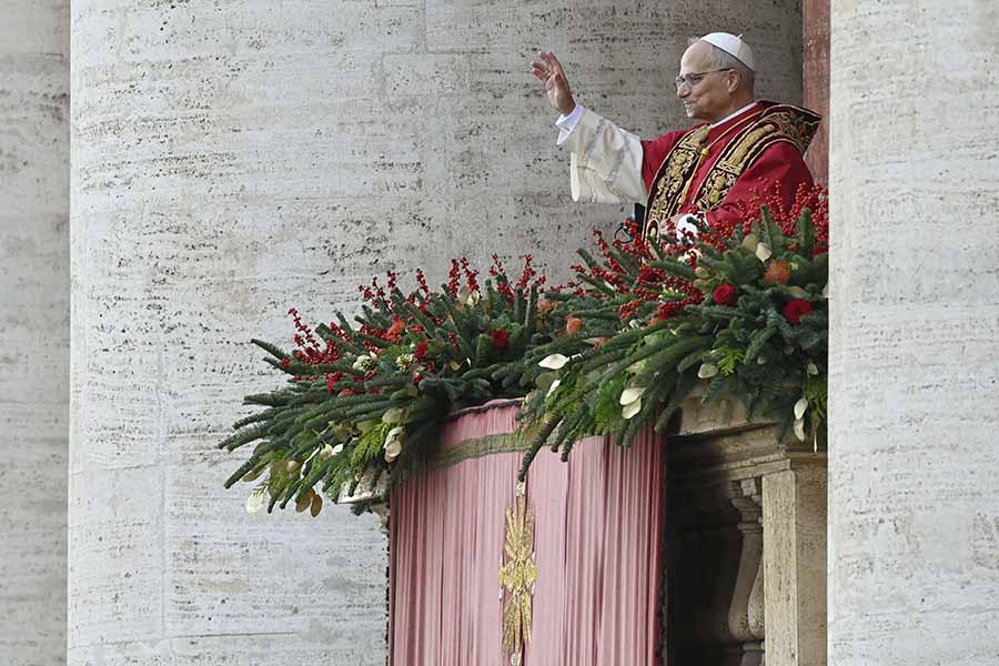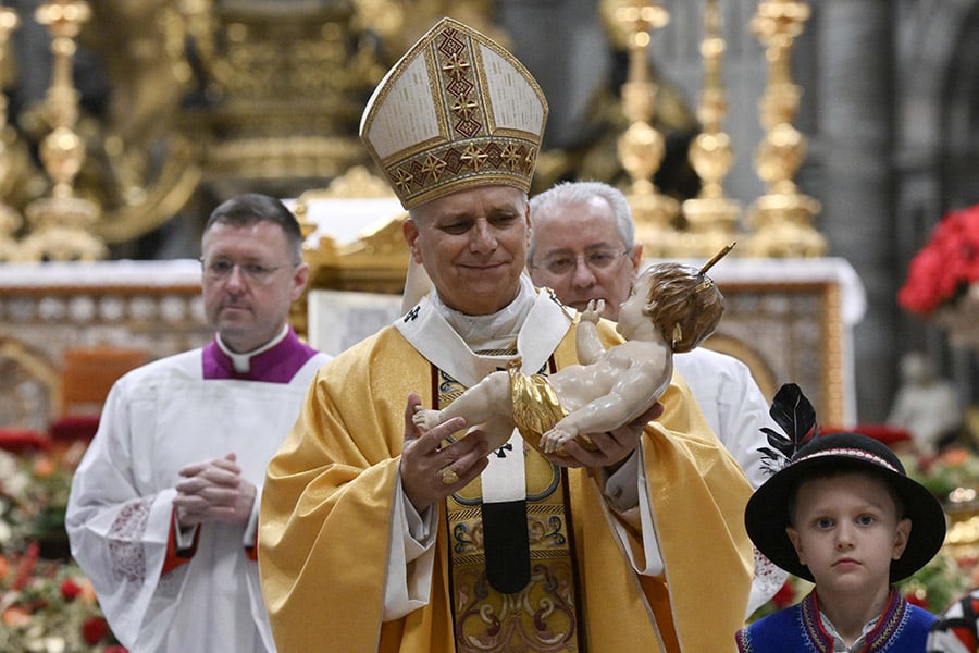 Open your hearts to baby Jesus and one another, pope says on Christmas December 25, 2025By Cindy Wooden Catholic News Service Filed Under: Christmas, Feature, News, Vatican, World News VATICAN CITY (CNS) — Jesus entering the world as a little baby in need of everything is a sign of God’s solidarity with every person in need, longing for love and a helping hand, Pope Leo XIV said at Christmas morning Mass. “The Word has pitched his fragile tent among us. How, then, can we not think of the tents in Gaza, exposed for weeks to rain, wind and cold; and of those of so many other refugees and displaced persons on every continent; or of the makeshift shelters of thousands of homeless people in our own cities?” he asked in his homily at the Mass Dec. 25 in St. Peter’s Basilica. Pope Leo XIV waves to an estimated 26,000 people gathered in St. Peter’s Square at the Vatican for his solemn blessing “urbi et orbi” (to the city and the world) Dec. 25, 2025. (CNS photo/Vatican Media) In celebrating the morning liturgy publicly, Pope Leo restored a tradition that had lapsed for 30 years. St. John Paul II did not preside over the liturgy in 1995 because he had the flu, and the morning Mass never returned to the papal calendar. Like his predecessors, Pope Leo went to the central balcony of St. Peter’s Basilica at noon to give his solemn blessing “urbi et orbi” (to the city and world). And, returning to a tradition set aside by Pope Francis, who claimed he was bad at languages, Pope Leo wished people a merry Christmas in 10 languages: Italian, French, English, German, Spanish, Portuguese, Polish, Arabic, Chinese and Latin. “Merry Christmas! May the peace of Christ reign in your hearts and in your families,” he said. In his homily and in his Christmas message before the “urbi et orbi” blessing, Pope Leo insisted that the Christian mission of sharing the good news of salvation in Christ means being serious about what is going on in the world and working to alleviate suffering, promote dialogue and end wars and violence. Taking on the fragile flesh of a baby, God wanted to identify with every human person, he said in the morning homily. “Fragile is the flesh of defenseless populations, tried by so many wars, ongoing or concluded, leaving behind rubble and open wounds,” he said. “Fragile are the minds and lives of young people forced to take up arms, who on the front lines feel the senselessness of what is asked of them and the falsehoods that fill the pompous speeches of those who send them to their deaths.” “When the fragility of others penetrates our hearts, when their pain shatters our rigid certainties, then peace has already begun,” the pope insisted. The response of Christians to suffering and violence must be firm but tender, he said. “We do not serve a domineering Word — too many of those already resound everywhere,” the pope said, but rather Christians profess and serve a Lord who “inspires goodness, knows its efficacy and does not claim a monopoly over it.” Pope Leo XIV gives his homily during Christmas morning Mass in St. Peter’s Basilica at the Vatican Dec. 25, 2025. A statue of the baby Jesus and an open Gospel are in the foreground. (CNS photo/Vatican Media) The peace proclaimed by Jesus, he said, will take root “when our monologues are interrupted and, enriched by listening, we fall to our knees before the humanity of the other.” Pope Leo continued his reflection in his “urbi et orbi” message, telling the crowd gathered in the rain in St. Peter’s Square that Jesus, “out of love,” wanted “to be born of a woman and so share our humanity; out of love, he accepted poverty and rejection, identifying himself with those who are discarded and excluded.” As is customary, the pope used his message to call attention to urgent needs and suffering in places around the globe and to urge people to help relieve that suffering. “Those who do not love are not saved; they are lost,” he said. “And those who do not love their brother or sister whom they see, cannot love God whom they do not see,” as the First Letter of John says. “If all of us, at every level, would stop accusing others and instead acknowledge our own faults, asking God for forgiveness, and if we would truly enter into the suffering of others and stand in solidarity with the weak and the oppressed, then the world would change,” Pope Leo said. Looking around the world, the pope prayed for peace and justice in dozens of countries, including Ukraine, and, as he did the night before and during the Christmas morning Mass, Pope Leo also called attention to the plight of migrants and refugees, asking governments to accept and assist them. “In becoming man,” he said, “Jesus took upon himself our fragility, identifying with each one of us: with those who have nothing left and have lost everything, like the inhabitants of Gaza; with those who are prey to hunger and poverty, like the Yemeni people; with those who are fleeing their homeland to seek a future elsewhere, like the many refugees and migrants who cross the Mediterranean or traverse the American continent.” “On this holy day, let us open our hearts to our brothers and sisters who are in need or in pain,” Pope Leo said. “In doing so, we open our hearts to the Child Jesus, who welcomes us with open arms and reveals his divinity to us.” Octavia Thuss and her son Henry Thuss from La Cañada, California, were among the 26,000 people in St. Peter’s Square for the pope’s blessing. They also had been in the square late the night before, watching the pope’s Christmas Mass on a screen in the rain. Since it was Pope Leo’s first Christmas as pope, “It was historic,” she said. “It was a really beautiful service.” Spending the Christmas holiday in Rome during the final days of the Jubilee Year added to the experience, since they were among some of the last pilgrims to pass through the Holy Doors at th