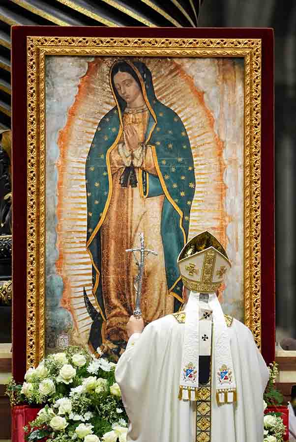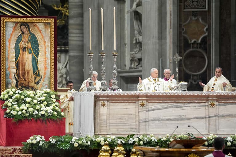 Our Lady of Guadalupe is the model of ‘perfect inculturation,’ Pope Leo says February 26, 2026By Courtney Mares OSV News Filed Under: Marian Devotion, News, Vatican, World News ROME (OSV News) — Pope Leo XIV has pointed to Our Lady of Guadalupe as the model of “perfect inculturation” as Mexico prepares to mark the 500th anniversary of the apparition in 2031 with a jubilee year. In a Feb. 24 message to the Theological-Pastoral Congress being held in Mexico City, the pope said Our Lady of Guadalupe “manifests God’s way of approaching his people.” Pope Leo XIV prays before an image of Our Lady of Guadalupe at the conclusion of his Mass for her feast day in St. Peter’s Basilica at the Vatican, Dec. 12, 2025. (CNS photo/Lola Gomez) The congress, running Feb. 24-26, was organized to prepare for the 500th anniversary of the Marian apparitions to St. Juan Diego on Tepeyac Hill in Mexico City. It is promoted by the Pontifical Commission for Latin America, the Mexican Episcopal Conference, the Knights of Columbus and the Pontifical International Marian Academy. “Our Lady of Guadalupe is a lesson in divine pedagogy on the inculturation of salvific truth,” Pope Leo said. “She does not canonize a culture or absolutize its categories, but neither does she ignore or despise them: they are assumed, purified, and transfigured to become a place of encounter with Christ.” In December 1531, Our Lady of Guadalupe appeared four times to St. Juan Diego, an Indigenous Mexican convert to Christianity, on Tepeyac Hill. She asked that a church be built in her honor on the site and left her image miraculously imprinted on St. Juan Diego’s tilma, or cloak, which remains on display today at the Basilica of Our Lady of Guadalupe in Mexico City. Scholars and theologians have long noted how the image on the tilma is rich with symbolism that was intelligible to the Nahuatl-speaking peoples of central Mexico from her turquoise mantle, associated with a queenly status in Aztec culture, to the black band around her waist, which was a sign of pregnancy in Indigenous tradition. The four-petaled flower, located on her garment over Our Lady’s womb, was an Aztec symbol for the center of the universe and the fullness of the divine. The pope said the apparitions on Tepeyac Hill can be seen as “a permanent criterion for discerning the evangelizing mission of the Church, called to proclaim the True God for whom we live, without imposing him, but also without diluting the radical newness of his saving presence.” Inculturation refers to the concept of making the Gospel incarnate in different cultures. The pope clarified that “inculturation does not equate to a sacralization of cultures or their adoption as a decisive interpretive framework for the Gospel message.” “To legitimize everything that is culturally given or to justify practices, worldviews, or structures that contradict the Gospel and the dignity of the person would be to ignore that every culture — like every human reality — must be enlightened and transformed by the grace that flows from the Paschal mystery of Christ,” Pope Leo added. He noted that Our Lady of Guadalupe exemplifies an inculturation that is “respectful in its starting point, intelligible in its language, and firm and delicate in its guidance toward the encounter with the full Truth, with the blessed Fruit of his womb.” “Inculturation is, rather, a demanding and purifying process, through which the Gospel, while remaining intact in its truth, recognizes, discerns, and assumes the semina Verbi present in cultures, and at the same time purifies and elevates their authentic values, freeing them from what obscures or disfigures them,” the pope said. Our Lady of Guadalupe is venerated as the patroness of the Americas. Pope Leo noted that “today, in many regions of the American continent and the world, the transmission of faith can no longer be taken for granted, particularly in large urban centers and pluralistic societies marked by visions of man and life that tend to relegate God to the private sphere or to dispense with Him altogether.” Pope Leo, who is on his Lenten retreat this week, signed the message on Feb. 5, the feast of St. Philip of Jesus, the first canonized saint born in Mexico. He pointed to the example of “many holy evangelizers and pastors” who can serve as examples and intercessors for the congress’ efforts, citing St. Toribio de Mogrovejo, St. Junípero Serra, Blessed Sebastián de Aparicio, St. Mamá Antula, St. José de Anchieta, Blessed Juan de Palafox, St. Pedro de San José de Betancur, St. Roque González, St. Mariana de Jesús and St. Francisco Solano. “And may Our Lady of Guadalupe, Star of the New Evangelization, accompany and inspire every initiative leading up to the 500th anniversary of her apparition,” Pope Leo said. Read More Vatican News Pope Leo XIV to embark on 10-day Africa tour, trips to Spain, Monaco Spanish bishops clarify Pope Leo XIV’s remarks following media reports U.S. visitors’ office saw big uptick in serving pilgrims during 2025 Pope Leo XIV says he considered a vocation with the Salesians as a boy Cardinals Müller, Sarah urge SSPX to submit to papal authority At Curia retreat, Bishop Varden warns of Gospel’s use ‘as a weapon in culture wars’ Copyright © 2026 OSV News Print