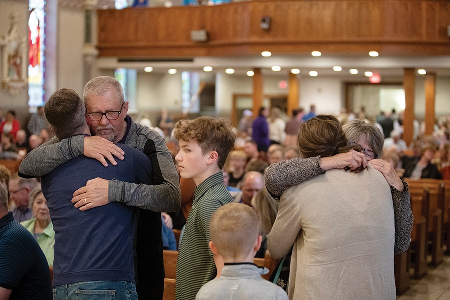 Parishioners remember fallen pastor, fatally shot a year ago, and continue to heal April 8, 2026By Marc and Julie Anderson, The Leaven OSV News Filed Under: Feature, Gun Violence, News, World News Five minutes. That’s how much time passed between Todd Leonard’s last meeting with Father Arul Carasala and the moment Leonard found the priest fatally wounded outside his own rectory in Seneca on April 3, 2025. A former principal of the parish school for 24 years, Leonard regularly met with Father Carasala, pastor of Sts. Peter and Paul Parish. As he walked back to the school that day, he thought he heard three gunshots. Uncertain, he returned to the rectory by another route.The shock he experienced remains etched in his memory. “I think over time that it’s not something that you’re going to forget,” Leonard said. “But you just have to remember the positives about Father Arul and all the positive things he did for the school and the church.” Father Carasala was ordained for the Diocese of Cuddapah in his native country of India in 1994 and arrived in the Archdiocese of Kansas City in Kansas in 2004. He became a U.S. citizen in 2011, serving in the parishes of Nemaha-Marshall County for over 20 years. Parishioners of Sts. Peter and Paul Parish in Seneca, Kan., embrace before a special Mass concelebrated by Archbishop Joseph F. Naumann of Kansas City on April 3, 2025, after the pastor, Father Raj “Arul” Carasala, was killed outside his own rectory earlier that day. (OSV News photo/Jay Soldner, The Leaven) The priest died of his injuries within hours of the shooting, and his alleged shooter turned himself in almost immediately. Father Carasala’s parishioners and Catholics across the archdiocese were left trying to make sense of his untimely death. A year later, retired Archbishop Joseph F. Naumann of Kansas City celebrated a liturgy on Good Friday, April 3, the anniversary of Father Carasala’s death. It was a chance for parishioners of Sts. Peter and Paul to continue what they’ve done all year — remember, honor and heal. “It’s really hard to believe that it’s been a year,” Leonard told The Leaven, the Kansas City’s archdiocesan news outlet. For Michelle Haverkamp, the timeline is just as vivid. Six days before Father Carasala’s death, she signed a contract to become principal. After seven years as assistant principal, she had hesitated, but the pastor reassured her. “He told me, ‘Don’t worry. I’ll be here. I wouldn’t leave you here your first year,'” she said. He introduced her at an all-school assembly that same day. The following Tuesday, he stopped by her classroom. “He said, ‘Everything’s going to be fine. You’re going to do great,'” Haverkamp recalled. “That was the last conversation I had with him.” In the months that followed, Haverkamp and Leonard led a grieving school community through difficult firsts — first Communion, graduation and a new school year. “We had a staff that was hurting and students that were sad,” Haverkamp said. Father Joel Haug, now pastor, led prayer services focused on healing, and seminarian Trey Niesen’s presence helped steady the school. “We talk openly about Father Arul,” Haverkamp said. “Sometimes it brings tears, but then the kids remember the positive things, and we move forward.” Traditions continued. When eighth graders wondered who would share a graduation meal with them, Father Haug stepped in. Now, a year later, Haverkamp sees renewal. “I feel like our school community is in a great place right now,” she said. Reminders of Father Carasala remain in every classroom, where candles bearing his photo glow throughout the day. For seventh grader Sophia Leonard, his memory is simple. “He was always giving us high fives,” she said. “He was always spreading joy and always smiling.” One lesson still stands out in her mind. “He said you can’t just go to church and light a candle. You have to go deeper in your faith.” That call has shaped the school’s response. “We talk a lot about what a blessing it is to receive the Eucharist,” Haverkamp said, noting that Mass, adoration and reconciliation have helped bring healing. “Jesus is present with us, and we’re not alone.” Parishioners Jim and Myra Runnebaum remember the shock of that day — and their concern for the school’s children. “I was more concerned about the kids than I was about myself,” Jim said. Healing took time. “It’s not something you rush,” he added. The couple later helped lead the creation of a memorial in the church’s narthex. A shadow box displays Father Carasala’s vestments and personal items, including a chasuble still marked with wax from a candle used during adoration shortly before his death. “It’s been an honor to do it for him,” Jim said. “It’s still been kind of hard,” Myra added. For many, the memories surface unexpectedly. “I kind of got a little teary-eyed,” said parishioner Bob Niehues of the first time he saw the shadow box. Many speak of Father Carasala’s continued presence. “He’s not gone,” Jim said. “His spirit is in everything that happens here.” Ahead of the Easter Triduum, Father Haug said that with the anniversary of Father Carasala’s death falling during that time it would be “an especially weighty moment of prayer and remembrance woven through the Passion of our Lord.” He said the past year has been marked by grief and grace. “We as a parish are still grieving,” he said. “His physical absence is felt. But I also believe that he gave his life for the church … and is accompanying this community.” The parish has honored Father Carasala through events like a memorial 5K, the “Rooted in Christ” event and a rosary and Mass on his birthday. Amid the sorrow, Father Haug sees a deepening of faith. “I’ve seen many people lean into their faith and start to find peace and healing,” he said. “The most powerful le