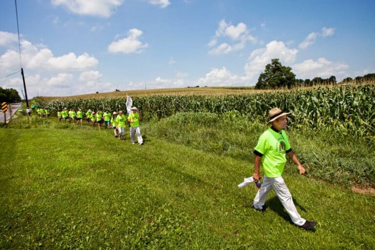 Pilgrims walk 100 miles for religious freedom August 7, 2012By George P. Matysek Jr. Catholic Review Filed Under: Feature, Local News, News, Religious Freedom, Video ANTIETAM CREEK – Three days and 30 miles into a 100-mile trek to Baltimore from the tiny Central Maryland town of Hancock, Laura Dudich lost count of her blisters. “My foot is covered in Band-Aids right now,” said the 17-year-old parishioner of St. Peter, Hancock, pausing briefly July 31 as she pounded the pavement along a farm-lined stretch of highway in Washington County. “I’m determined not to quit,” Dudich insisted. “I want to go to the end. This is a cause I really want to stand up for.” Supporting religious freedom was the goal of Dudich’s walk, which began July 29 at St. Peter and attracted 24 other Catholic pilgrims from throughout the area. Additional walkers joined the pilgrimage as it proceeded, swelling the group to 100 as it reached its final destination, the Basilica of the National Shine of the Assumption of the Blessed Virgin Mary in Baltimore, Aug. 5. Organized by Father John “Jack” Lombardi, administrator of St. Peter, Hancock, and St. Patrick, Little Orleans, the trek was designed to call attention to a new federal health care mandate requiring all employers to provide insurance coverage for abortion-inducing drugs, sterilizations and contraceptives. Led by a man carrying a flag emblazoned with “An Appeal to Heaven,” the pilgrims walked 13 miles a day – stopping at Catholic parishes and other locations along the way to sleep and refuel. They wore bright neon T-shirts, whose back bore the message, “We’re Walking for YOU!” As the pilgrims approached the basilica – America’s first cathedral and an international symbol of religious freedom – they were accompanied by a police escort and were cheered by supporters. Bishop Denis J. Madden celebrated a special 4:30 p.m. Mass and extended greetings on behalf of Archbishop William E. Lori. Kimberly Mose, 18 and a parishioner of St. Mary, Hagerstown, said the pilgrimage had three goals: penance for the nation, alerting others to threats to religious freedom and winning souls to God. “It’s a great way to spread our faith as we are taught by our parents,” Mose said. “The church is being forced to provide contraceptives and stuff like that. It’s going against our beliefs and it needs to stop.” As a passing motorist beeped his horn in support while she marched in Washington County, Mose said she was encouraged by the people she met along the journey. “We haven’t had any negative response,” she said, noting that the pilgrims distributed information cards and rosaries. “People are very interested and they want to know what we are doing.” As walkers took a break July 31 beneath a hot sun, a man whose body was nearly covered in tattoos asked for rosaries. A non-Catholic who said he read the Bible while he had been incarcerated, the man bowed his head in prayer as one of the adult pilgrims prayed for him. “None of them know me,” the man told the Catholic Review, asking not to be identified, “but they prayed for me. It means a lot when someone says they’ll pray for you.” Bill Webster, a 60-year-old parishioner of St. Peter, said he hopes participating in the pilgrimage dispels apathy about genuine threats to religious liberty. “I don’t think most Catholics realize the importance of where we are right now and what’s slowly being taken away from us,” he said. “There’s nothing you can do in Washington politically other than vote, but you can get out to walk and it might draw attention and change a heart or a mind – and get people stirred up.” Webster said change must start at the bottom “with little steps,” adding, “It’s not going to come from the top.” James Webbert, a 61-year-old parishioner of St. Ursula, Parkville, found the pilgrimage enriching. “We’re physical and we’re spiritual,” he said. “Walking for religious freedom really compelled me. I want to do something with my whole person – body and soul.” Father Lombardi said several businesses and supporters donated meals for the walkers. Pilgrims also received pledges for every mile travelled. More than $6,000 ($1,000 more than their goal) was raised for the St. Vincent de Paul Society of Baltimore and the Interfaith Service Coalition in Hancock. “The entire pilgrimage was a transcendent experience,” Father Lombardi said. “It was part rollercoaster ride, part marathon and part retreat all in one. You endure for the Lord and celebrate his compassion and also his challenge in the world to stand up for the faith.” Click play below to watch a video of the pilgrimage. Email George Matysek at gmatysek@CatholicReview.org Copyright © 2012 Catholic Review Media Print