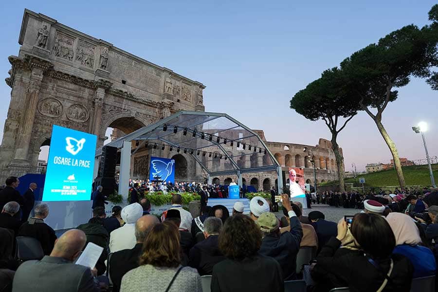 Political leaders have duty before God to end war, pope says at peace meeting October 28, 2025By Carol Glatz Catholic News Service Filed Under: Ecumenism and Interfaith Relations, Feature, News, World News ROME (CNS) — The world is thirsting for peace and for an end to abuses of power and indifference to the rule of law, Pope Leo XIV said at an international gathering for peace. Standing before dozens of representatives of the world’s religions and Rome’s immense Arch of Constantine, which commemorates a military victory by the ancient Roman emperor in the fourth century, Pope Leo said to applause, “Enough of war, with all the pain it causes through death, destruction and exile!” “We must ensure that this period of history, marked by war and the arrogance of power, soon comes to an end, giving rise to a new era,” he said Oct. 28. “We cannot allow this period to continue,” he said. “Enough! This is the cry of the poor and the cry of the earth. Enough! Lord, hear our cry!” Pope Leo XIV speaks in front of the Arch of Constantine and Rome’s Colosseum Oct. 28, 2025, as he joined representatives of other religions and Christian communities to appeal for peace. (CNS photo/Lola Gomez) The outdoor gathering marked the closing ceremony of the annual International Meeting of Dialogue and Prayer for Peace organized by the Rome-based Community of Sant’Egidio. More than 10,000 people took part in a series of associated talks and events held in Rome Oct. 26-28. “The world is thirsting for peace. We need a true and sound era of reconciliation that puts an end to the abuse of power, displays of force and indifference to the rule of law,” the pope said in his address. “We are now gathered together to proclaim a message of reconciliation,” he said, because war does nothing to help confront or resolve conflicts. “I thank you for coming here to pray for peace and for showing the world just how important prayer is” as a powerful force for reconciliation, he told ecumenical and interreligious representatives from all over the world. “Those who practice religion without prayer run the risk of misusing it, even to the point of killing,” he said. Prayer “is not shouting words, displaying behavior or religious slogans against God’s creatures.” “War is never holy; only peace is holy, because it is willed by God!” he said. Prayer is “a movement of the spirit and an opening of the heart,” and, as such, can change the course of history, he said. “May places of prayer be tents of encounter, sanctuaries of reconciliation and oases of peace.” “The culture of reconciliation will overcome the current globalization of powerlessness, which seems to tell us that another era is impossible,” the pope said. Dialogue, negotiation and cooperation can address and resolve today’s tensions and conflicts; the necessary forums and people exist. Pope Leo XIV attends an ecumenical Christian prayer inside Rome’s Colosseum Oct. 28, 2025, before joining representatives of other religions outside to appeal for peace. The pope is standing between Greek Orthodox Patriarch Theodore II of Alexandria and Catholicos Awa III, patriarch of the Assyrian Church of the East. The International Meeting of Dialogue and Prayer for Peace was organized by the Rome-based Community of Sant’Egidio. (CNS photo/Pool, Cristian Gennari) “To put an end to war is a solemn duty before God incumbent on all those holding political responsibilities,” he said. “Peace is the priority of all politics.” As religious leaders, he said, “We must dare peace!” The ceremony included the reading of a joint appeal for peace, which lamented the horrors of war and the growing inequalities and hatred between peoples. “Old ghosts have reemerged, reviving nationalism and ethnic and racial hatreds, encouraging fear, dazzled and comforted by the production of immense wealth in the hands of very few,” the appeal said. “Religions offer what they have received from God: love, wisdom, the value of life, forgiveness,” it said. That is why they underlined their commitment and appeal to world leaders to “relearn the art of living together. Let us build bridges, not walls. Let us stop wars and open a time of reconciliation, for security based on dialogue and not on the escalation of arms production and threats.” “Let us abandon the era of force and enter into an era of dialogue and negotiation, which alone can bring peace and security,” said the written appeal, which was ceremoniously handed out by 22 children as a scroll tied with a sprig from an olive tree to leaders representing the world of religion, diplomacy and civil society. The final ceremony with Pope Leo also included an ecumenical prayer service inside the Colosseum, which has been a symbol of Christian persecution, as it is believed to have been the site of the execution of early Christians. Joining representatives of Christian communities there, Pope Leo said, “never before has humanity so greatly needed peacemakers.” He called on all Christians to unite their hearts and “be filled with the power of God’s love — a love capable of making possible what seems impossible in the eyes of humankind.” “O Father, in your mercy, may our united prayer hasten the hour of victory over evil, war and terrorism; and may humanity, reconciled by the power of your Holy Spirit, be healed from all violence,” he prayed. After the ecumenical prayer service, the pope left the Colosseum to greet and join dozens of leaders representing Judaism, Islam, Buddhism, Sikh and other faith communities from around the world as they took to a stage in front of the Arch of Constantine. The event was part of an annual event launched after St. John Paul II’s historic prayer for peace in Assisi Oct. 27, 1986, attended by religious leaders from all over the world “This historic event marked a turning point in interfaith relations,” Pope Leo said in his mai