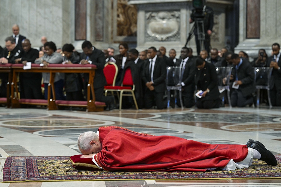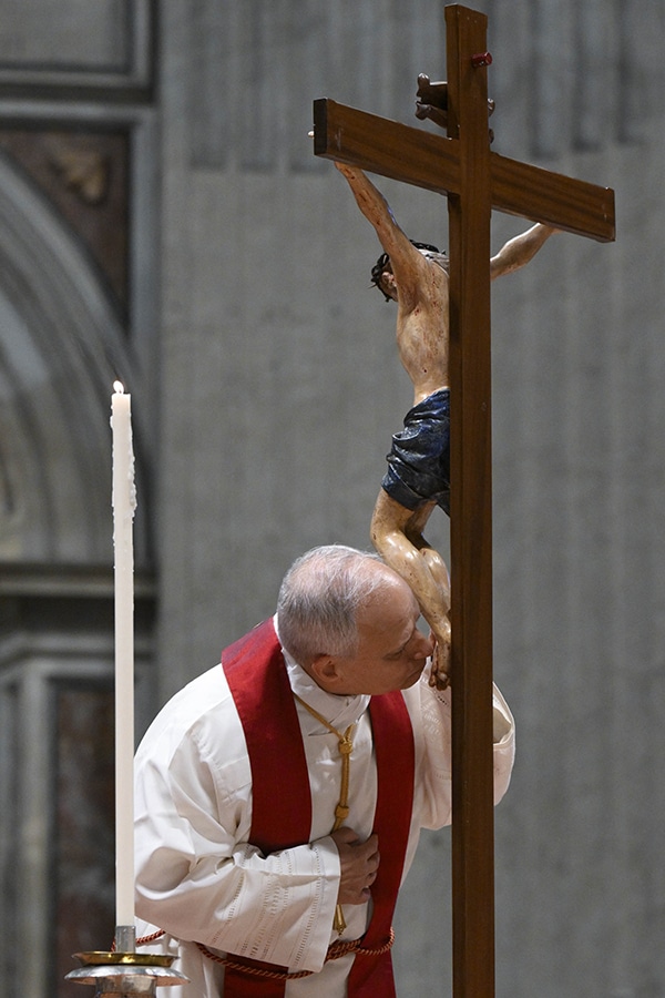 Pope at Colosseum: Follow Christ’s path, including the Way of the Cross, to bring peace April 3, 2026By Carol Glatz OSV News Filed Under: Easter, Feature, News, Vatican, World News Life must be lived as a journey seeking to follow in Jesus’ footsteps, Pope Leo XIV said after completing the Stations of the Cross at Rome’s Colosseum. “Let us make our own the prayer by which St. Francis invites us to live our lives as a journey of ever-deepening participation in the communion of love that unites the Father, the Son and the Holy Spirit,” he said at the conclusion of the nighttime service April 3. It was the first time since 2022 that a pope presided in person at the candlelit ceremony; several bouts of poor health had prevented Pope Francis from attending the ceremony in his final years. It was also the first time since 1994 a pope carried the cross for all 14 stations — something St. John Paul II had started at the beginning of his pontificate. Pope Leo told reporters March 31 that carrying the cross for the entire route would be “an important sign because of what the pope represents — the spiritual leader of the world today — and because of this message that everyone wants to hear and say: that Christ still suffers.” “I, too, carry all this suffering in my prayers, and I would like to invite all people of goodwill, people of faith, all Christians, to walk together, to walk with Christ who suffered for us to give us salvation and life, and to seek how we, too, can be bearers of peace and not of hatred,” he had said. Because 2026 marks the 800th anniversary of the death of St. Francis of Assisi, Pope Leo asked Franciscan Father Francesco Patton, who served as custos of the Holy Land from 2016 to 2025, to write the meditations for this year’s Good Friday service. Pope Leo XVI lies prostrate as he leads the Good Friday Liturgy of the Lord’s Passion in St. Peter’s Basilica at the Vatican April 3, 2026. (OSV News photo/Simone Risoluti, Vatican Media) St. Francis always invited the faithful to follow in the footsteps of Jesus, the Franciscan priest wrote in his introduction. May walking the Way of the Cross “be more than a mere ritual or intellectual journey, but one that transforms our entire person and life.” The readings, prayers and reflections touched on the many forms of suffering and pain afflicting the world today, and implored deliverance from evil, temptations and fear. “Every person in authority will have to answer to God for the way they exercise their power,” he wrote for the first station, “Jesus is condemned to death.” People have the power to: judge; start or end a war; instill violence or peace; fuel the desire for revenge or for reconciliation; use the economy to oppress people or to liberate them from misery; trample on human dignity or to uphold it; and the power to promote and defend life, or reject and stifle it, he wrote. But Jesus says, “whatever you do to another human being, especially to the small and vulnerable, you do unto me. And it is to me that you will one day give an account,” he wrote. True power, he wrote for the 11th station, “Jesus is nailed to the cross,” is rooted in learning how to forgive “and to bear the difficulties of life in peace, because it is not love of power that conquers, but the power of love.” For the eighth station, “Jesus meets the women of Jerusalem,” Father Patton wrote about the women who weep throughout history. “For centuries, they have wept for themselves and for their children, children taken away and imprisoned during protests, deported by policies devoid of compassion, shipwrecked on desperate journeys of hope, killed in war zones, and wiped out in death camps.” “Give us tears once more, Lord, lest our conscience fade into the fog of indifference and we cease to be fully human,” he wrote. For the 10th station, “Jesus is stripped of his garments,” the priest wrote about the many forms of violation repeated today, such as torture, intrusive surveillance, rape and abuse. It also includes “when the entertainment industry exploits nudity for the sake of profit; when the media exposes individuals to public opinion; and even when we ourselves, through our curiosity, fail to respect the modesty, intimacy and privacy of others.” “Remind us, Lord, that each time we fail to recognize the dignity of others, our own dignity is diminished. And whenever we condone or take part in inhuman behavior toward any person, we ourselves become less human,” he wrote. At the conclusion of the Way of the Cross, Pope Leo gave his blessing and repeated a prayer written by St. Francis, asking that “God give us miserable ones the grace to do for you alone what we know you want us to do and always to desire what pleases you.” “Inwardly cleansed, interiorly enlightened and inflamed by the fire of the Holy Spirit, may we be able to follow in the footprints of your beloved Son, our Lord Jesus Christ, and, by your grace alone, may we make our way to you,” he prayed. Pope Leo XVI venerates a crucifix as he leads the Good Friday Liturgy of the Lord’s Passion in St. Peter’s Basilica at the Vatican April 3, 2026. (OSV News photo/Elisabetta Trevisani, Vatican Media) Earlier in the day, the pope presided over the Liturgy of the Lord’s Passion, which commemorates Christ’s passion and death on the cross. The rite began with Pope Leo’s silent procession down the central nave. Dressed in red vestments, symbolizing the blood of Christ’s Passion, he somberly lay prostrate before the altar, a sign of adoration and penance. The readings recounted Christ’s passion and death on the cross. At the moment of the veneration of the cross, the pope removed his chasuble and shoes and knelt before the crucifix in a gesture of humility. Clergy followed one by one, venerating the cross on bended knee and with a kiss. Following tradition, the homily was delivered by Capuchin Father Roberto Pasoli