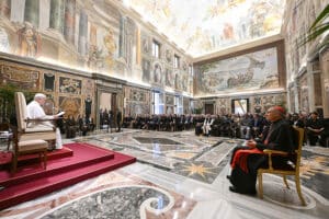 The pope urged his audience to “identify local and international ways of developing new forms of social charity, alliances between different areas of knowledge and solidarity between generations.”