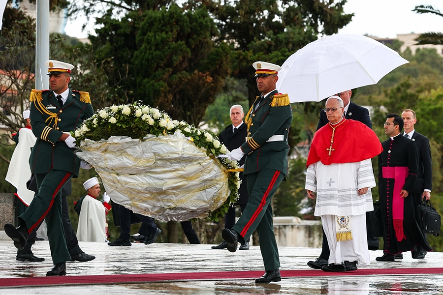 Pope Leo arrives in Algeria on first-ever papal visit to the country April 13, 2026By Courtney Mares OSV News Filed Under: Feature, News, Vatican, World News ALGIERS (OSV News) — Pope Leo XIV arrived in Algeria on the morning of April 13, becoming the first pope to make an apostolic journey to the North Africa nation, the first stop of the pope’s 11-day, four-country tour of Africa. Speaking to journalists on the flight to Algiers, Pope Leo revealed that his trip to Africa was “meant to be the first trip of the pontificate.” Pope Leo XIV addresses journalists during the flight heading to Algiers on April 13, 2026. Pope Leo XIV embarks on April 13 on an 11-day visit to Algeria, Cameroon, Angola and Equatorial Guinea for his first major international trip since becoming pontiff in May 2025. (OSV News/Alberto Pizzoli, Reuters) “Already last year, in May, I said, ‘On my first trip, I would like to travel to Africa,'” Pope Leo said on the papal plane, a chartered ITA Airways flight. “I am very happy to visit the land of St. Augustine again,” he added, saying that Augustine “offers a very important bridge in interreligious dialogue” and “is much loved in his homeland, as we will see.” The pope emphasized, “We must always seek bridges to build peace and reconciliation. And so, this trip truly represents a precious opportunity to continue with the same voice, with the same message.” Calling the trip “very special for several reasons,” the pope said it is “a blessing for me personally,” expressing hope that the visit will also be a blessing “for the Church and the world.” During the flight, Pope Leo also responded to a personal attack made by President Donald Trump on social media the night before, telling journalists, “I have no fear of the Trump administration or speaking out loudly of the message of the Gospel, which is what I believe I am here to do, what the Church is here to do.” The papal plane touched down at Houari Boumediene Airport in Algiers shortly before 10 a.m. local time following a two-hour flight from Rome. Since heavy rain was in the forecast, the welcoming ceremony in Algeria’s capital city was moved indoors. The pope was greeted by Algerian President Abdelmadjid Tebboune as an honor guard stood at attention and a young girl presented the pope with flowers. The pope’s visit to Algeria marks a historic milestone in a country that is 99% Sunni Muslim and home to fewer than 9,000 Catholics among a population of more than 45 million people. Algerian bishops said the pope comes “as an apostle of peace,” seeking to strengthen a Church whose mission is one of “fraternal presence” in a predominantly Muslim society. From April 13 to 23, the 70-year-old pope is scheduled to travel a total of 11,000 miles on 18 flights, visiting 11 cities across Algeria, Cameroon, Angola and Equatorial Guinea. The American pope is expected to deliver addresses in English, French, Portuguese and Spanish. In Algeria he will speak primarily in English. Algeria, the largest country in Africa, is dominated by the vast Sahara Desert, yet the pope’s itinerary here is centered on the country’s northern Mediterranean coast, with stops in Algiers and Annaba. — The ‘Son of Augustine’ returns — Pope Leo XIV visits Maqam Echahid (Martyrs’ Memorial) monument in El Madania, Algiers, Algeria, April 13, 2026, to begin his apostolic journey to Algeria, Angola, Cameroon and Equatorial Guinea. (OSV News photo/Guglielmo Mangiapane pool via Reuters) The visit carries particular significance for Pope Leo, who described himself as a “son of Augustine” on the day of his election on May 8, 2025. St. Augustine, served as bishop of Hippo Regius, near the present-day Algerian city of Annaba, and died there in A.D. 430. The pope first visited Algeria in 2003 when he was serving as prior general of the Augustinian order and returned again in 2014. “The Holy Father has already visited Algeria twice,” Bishop Michel Guillaud of Constantine-Hippone told OSV News. Pope Leo’s apostolic visit to Algeria, he added, is primarily “to meet the Algerian people and to support his Church, drawing on the strong bond between them through the figure of Augustine.” — Remembering Algeria’s Catholic martyrs — In addition to St. Augustine and St. Monica, Algeria is also known as the site of more modern witnesses to the faith. In 2018, the Church beatified 19 martyrs killed during the Algerian Civil War, including Trappist monks whose story was depicted in the film Of Gods and Men. On his first day in Algeria, Pope Leo will make a private visit to the Augustinian Missionary Sisters of Bab El Oued, honoring the memory of two of their members, Sister Esther Paniagua Alonso and Sister Caridad Álvarez Martín, who were killed in 1994 while on their way to Mass. The two sisters were among the 19 martyrs beatified in 2018. Today the Augustinian sisters continue to serve the local population through education and outreach programs for children, youth and women. Another beloved Catholic figure linked to Algeria is St. Charles de Foucauld, the French hermit and missionary who lived among the Tuareg people in the Sahara and was canonized in 2022 by Pope Francis. — Interfaith dialogue in a majority-Muslim nation — After the airport welcome, the pope’s first public engagement is at the Maqam Echahid Memorial, honoring those who died in the country’s struggle for independence from France. On his first day in Algiers, Pope Leo is also scheduled to meet civil authorities and visit the Great Mosque of Algiers, one of the largest mosques in the world, in a gesture aimed at reinforcing Christian-Muslim dialogue. In the evening, the pope is expected to meet with local Christians at the Basilica of Our Lady of Africa, perched above the Mediterranean Sea. Algeria’s history stretches from its role as a breadbasket of the Roman Empire to centuries under Arab-Amazigh dynasties a