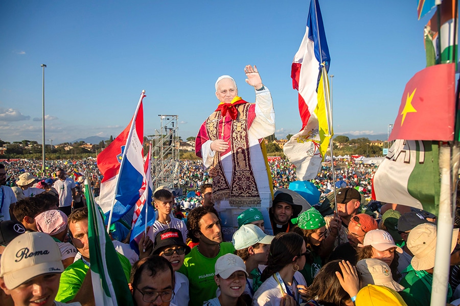 Pope Leo urges youth to find hope, friendship in Christ in uncertain times August 3, 2025By Junno Arocho Esteves Catholic News Service Filed Under: Feature, Jubilee 2025, News, Vatican, World News ROME — Addressing an estimated 1 million young people, Pope Leo XIV urged them to forge genuine relationships rooted in Christ rather than ephemeral online connections that can reduce individuals to a commodity. “When a tool controls someone, that person becomes a tool: a commodity on the market and, in turn, a piece of merchandise,” the pope said during the evening prayer vigil for the Jubilee of Youth Aug. 2. “Only genuine relationships and stable connections can build good lives.” The pope arrived by helicopter at the Tor Vergata field, roughly eight miles southeast of Rome’s city center, and was greeted with cheers from young people waving flags. Many of the youth camped out overnight, sleeping in tents and sleeping bags on the dusty field, much like the World Youth Day celebration held 25 years ago in the same location. Countless young people kicked up the dust from the field as they rang alongside the popemobile to catch a glimpse of the pontiff. Pope Leo smiled and waved at the youth, occasionally catching objects and plush toys that were hurled his way. Pilgrims carry a cardboard cutout of Pope Leo XIV surrounded by flags from various countries as they gather at Tor Vergata in Rome for the Jubilee of Youth vigil Aug. 2, 2025. (CNS photo/Pablo Esparza) Exiting the popemobile, he was handed the large Jubilee year cross, which he carried to the main altar, accompanied by dozens of young people. After beginning the vigil with prayers, the pope engaged in a dialogue with several young people who asked him three questions. Dulce Maria, a 23-year-old woman from Mexico, spoke of the excitement of online friendships but also the loneliness that comes from connections that are “not true and lasting relationships, but rather fleeting and often illusory.” “How can we find true friendship and genuine love that will lead us to true hope? How can faith help us build our future?” she asked. Pope Leo acknowledged the potential of the internet and social media as “an extraordinary opportunity for dialogue,” but warned that these tools “are misleading when they are controlled by commercialism and interests that fragment our relationships.” Drawing from his Augustinian spirituality, Pope Leo urged young people to emulate St. Augustine, who had a “restless youth, but he did not settle for less.” “How did he find true friendship and a love capable of giving hope? By finding the one who was already looking for him, Jesus Christ,” the pope said. “How did he build his future? By following the one who had always been his friend.” Gaia, a 19-year-old woman from Italy, asked how young people can find the courage to make choices amid uncertainty. “To choose is a fundamental human act,” the pope responded. “When we make a choice, in the strict sense, we decide who we want to become.” Pilgrims gather at Tor Vergata in Rome ahead of the vigil with Pope Leo XIV Aug. 2, 2025, part of the Jubilee of Youth celebrations. (CNS photo/Pablo Esparza) He encouraged young people to remember they were chosen by God, and that “the courage to choose comes from love, which God shows us in Christ.” The pope recalled St. John Paul II’s words spoken in the same place 25 years ago, reminding the youth that “it is Jesus in fact that you seek when you dream of happiness; he is waiting for you when nothing else you find satisfies you.” The pope called “radical and meaningful choices,” such as marriage, priesthood and religious life, “the free and liberating gift of self that makes us truly happy.” “These choices give meaning to our lives, transforming them into the image of the perfect love that created them and redeemed them from all evil, even from death,” he said. Departing from his prepared remarks, Pope Leo expressed condolences for the deaths of two pilgrims. Pascale Rafic, an 18-year-old pilgrim from Egypt, died due to a heart condition. Earlier in the day, the pope met with a group of Egyptian youth who Rafic traveled with to Rome. Maria Cobo Vergara, a 20-year-old pilgrim from Madrid, Spain, died July 30. While the cause of death was not mentioned in a statement published Aug. 1, the Archdiocese of Madrid said the young pilgrim suffered “four years of illness.” “Both (pilgrims) chose to come to Rome for the Jubilee of Youth, and death has taken them in these days,” the pope said at the vigil. “Let us pray together for them.” Pope Leo XIV carries the Jubilee Cross as he walks to the altar before the start of the vigil with young people gathered in Tor Vergata in Rome Aug. 2, 2025, during the Jubilee of Youth. (CNS photo/Lola Gomez) Lastly, 20-year-old Will, a young pilgrim from the United States, asked the pope how to “truly encounter the Risen Lord in our lives and be sure of his presence even in the midst of trials and uncertainties.” Recalling Pope Francis’ papal bull for the Holy Year 2025, “Spes non confundit” (“Hope Does Not Disappoint”), Pope Leo said that “hope dwells as the desire and expectation of good things to come,” and that one’s understanding of good “reflects how our conscience has been shaped by the people in our lives.” He urged them to foster their conscience by listening to Jesus’ word and to “reflect on your way of living, and seek justice in order to build a more humane world.” “Serve the poor, and so bear witness to the good that we would always like to receive from our neighbors,” he said. “Adore Christ in the Blessed Sacrament, the source of eternal life. Study, work and love according to the example of Jesus, the good Teacher who always walks beside us.” He also invited young people to pray to remain friends with Jesus and be “a companion on the journey for anyone I meet.” “Through