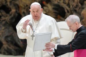 At the end of the audience, the pope took the microphone to ask that people remember the many countries suffering from the effects of war: “martyred Ukraine, Israel, Jordan — so many countries that are suffering there — let us remember the displaced people of Palestine, and let us pray for them.”