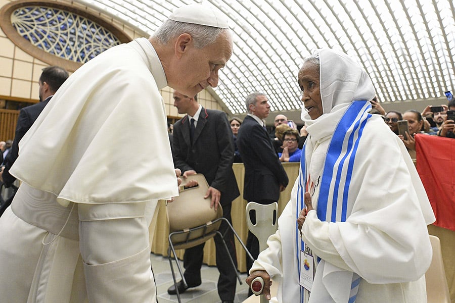 Pope: Opioid crisis, cruelty toward migrants are new social ills October 23, 2025By Carol Glatz Catholic News Service Filed Under: Feature, Immigration and Migration, News, Vatican, World News VATICAN CITY (CNS) — The current abuse of vulnerable migrants is not the legitimate exercise of national sovereignty, Pope Leo XIV said, but rather it represents a serious crime being committed or tolerated by the government. “Ever more inhuman measures are being adopted — even celebrated politically — that treat these ‘undesirables’ as if they were garbage and not human beings,” he said without mentioning any specific country during an address to so-called popular movements meeting at the Vatican Oct. 23. “States have the right and the duty to protect their borders, but this should be balanced by the moral obligation to provide refuge,” he said. For Christians, the pope said, God is love, and he “creates us and calls us to live as brothers and sisters.” The theme of protecting the rights and dignity of the world’s immigrants was just one issue the pope addressed in a major speech that laid out some of the “new” social ills the church must focus on, such as: the deadly opioid crisis in the United States; online gambling; consumeristic lifestyles fueled by social media; so-called “conflict minerals”; and the poor being given easy access to new technologies while their fundamental needs of food, shelter and work are cut off or ignored. Pope Leo XIV greets a woman during a gathering of popular movements as part of their Jubilee in the Paul VI Audience Hall at the Vatican Oct. 23, 2025. (CNS photo/Vatican Media) The gathering in the Paul VI Audience Hall was part of the Jubilee of Popular Movements and the Fifth World Meeting of Popular Movements taking place in Rome Oct. 21-24. The popular movements include those that organize informal workers who collect and recycle trash, gather people who live in the informal settlements on the outskirts of cities, rally citizens to promote care of the environment, assist subsistence farmers and rescue migrants at sea. Pope Leo greeted the participants and assured them that, like his predecessor Pope Francis, he believed “housing, work and land are sacred rights, it is worthwhile to fight for them, and I would like you to hear me say ‘I am here,’ ‘I am with you!'” He reiterated that he chose the name Leo because of Pope Leo XIII’s landmark encyclical, “Rerum Novarum.” Latin for “Of New Things,” the 1891 document addressed the new social and economic challenges posed by the Industrial Revolution, particularly its impact on labor and workers’ rights. Too often, Pope Leo XIV said, when society looks at the “new things” of the day, it looks at “what’s new” for the privileged, the powerful and the financially secure, like “autonomous vehicles, high-end mobile phones, cryptocurrencies and other such things.” “From the peripheries, however, things appear differently,” he said. “Is asking for housing, work and land, including food for the excluded, a ‘new thing’?” he asked. These basic, fundamental needs are “so current” that they merit “an entire chapter in Christian social thought on the excluded in today’s world.” In fact, he said, Pope Leo XIII “did not concentrate on industrial technology or on new sources of energy, but rather on the situation of workers,” the poor and the oppressed. “For the first time and with absolute clarity, a pope said that the daily struggle for survival and for social justice were of fundamental importance for the church,” he said. In his five-page speech, the pope sought to look at the “new things” happening on “the periphery,” that is, “the problems that strike the excluded” and marginalized of today. Notably, in today’s world, many old injustices continue, he said. Progress must always be “managed through an ethic of responsibility, overcoming the risk of idolizing profit, and putting the human person and their integral development at the center,” he said, especially by including marginalized communities “in a collective and united effort to invert the dehumanizing tendencies of social injustices.” “We should ensure that the ‘what’s new’ be managed in an appropriate way,” he said. “The question should not remain only in the hands of the political, scientific or academic elites, but rather should involve all of us.” “Reversing the course that continues dramatically excluding millions of people who remain on the margins,” he said, is “a central point in the debate on the ‘new things.'” Today, he said, “exclusion is the new face of social injustice.” However, there is a surprising paradox, he said. “The lack of land, food, housing and decent work coexists with access to the new technologies.” “Cell phones, social networks and even artificial intelligence are in the pockets of millions of persons, including the poor,” he said, but more fundamental needs must not be neglected. Pope Leo blamed this “systemic arbitrariness” on “bad management” that “generates and increases inequalities with the pretext of progress.” When promoting human dignity is not the focus, then “the system fails also in justice.” Some “new things” today, such as climate change, have a more devastating impact on the poor, the pope said. But there is also “the new thing” of the pharmaceutical industry, he said. While advances in medicine represent “great progress for some,” he said, “a cult of physical well-being is being promoted, almost an idolatry of the body.” Any mentality that reduces “the mystery of pain” to something totally inhuman can lead to a dependence on pain medications, he said, “the sale of which obviously goes to increasing the earnings of the same pharmaceutical companies.” “This also leads to dependence on opioids, as has been devastating, particularly in the Un