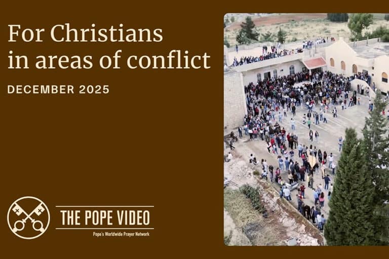 Pope prays for Christians in war zones, especially the Middle East November 27, 2025By Carol Glatz Catholic News Service Filed Under: Conflict in the Middle East, News, Vatican, World News VATICAN CITY (CNS) — Pope Leo XIV has asked Catholics to join him in praying for Christians living in areas of war or conflict, especially in the Middle East. May they “be seeds of peace, reconciliation and hope,” he said. The pope’s video sharing his prayer intention for December was distributed Nov. 26 by the Pope’s Worldwide Prayer Network. “Today we pray for Christians living amidst wars and violence. Even surrounded by pain, may they never cease to feel the gentle kindness of your presence and the prayers of their brothers and sisters in faith,” he prayed in the video. Only through God, “and strengthened by fraternal bonds, can they become the seeds of reconciliation, builders of hope in ways both small and great, capable of forgiving and moving forward, of bridging divides and of seeking justice with mercy,” Pope Leo said. “Lord Jesus, who called blessed those who work for peace, make us your instruments of peace even where harmony seems impossible,” he prayed. “Holy Spirit, source of hope in the darkest times, sustain the faith of those who suffer and strengthen their hope,” the pope prayed. “Do not let us fall into indifference, and make us builders of unity, like Jesus.” Read More Vatican News Love without fear, pope tells Lebanese church workers Pope urges Lebanese not to give up on peace or each other Holding inflight news conference, pope talks about peace in Gaza, Ukraine Ecumenism is not ‘absorption or domination,’ but sharing gifts, pope says Pope gives Catholics in Turkey Advent ‘resolutions’ — building bridges An easy morning with Pope Leo Copyright © 2025 Catholic News Service/U.S. Conference of Catholic Bishops Print