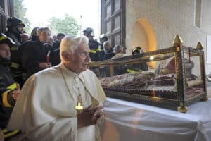 When then-Pope Benedict XVI visited in 2009, he placed the long woolen pallium he had worn during his installation Mass on top of Pope Celestine’s glass casket as a gift. When Pope Benedict resigned in 2013, many people wondered if that gesture four years earlier had been a sign.