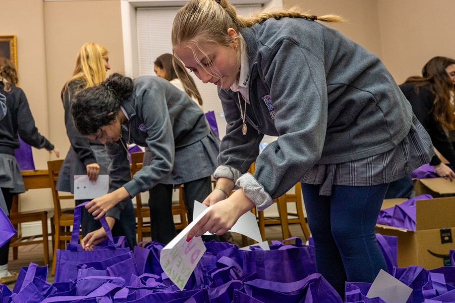 Purple Sheep Project going strong after 12 years, emphasizing joy of giving April 13, 2026By Erik Zygmont Special to the Catholic Review Filed Under: Feature, Giving, Local News, News, Schools For three-quarters of her life, Gabriela Huff, 16, has made her birthday about giving rather than getting. “It’s become a thing,” said Huff, a junior at Mount de Sales Academy in Catonsville. “I don’t want gifts anymore; I just love giving gifts.” Jessica Nahmias, left, service coordinator and foreign language teacher at Mount de Sales Academy in Catonsville, stands with students involved in the Purple Sheep Project. . (Kevin J. Parks/CR Staff) The Catholic Review first reported on Huff’s Purple Sheep Project – her annual gift drive for children in need occurring near her Feb. 27 birthday – 10 years ago. Huff was then a student at St. Louis School in Clarksville. She and her parents, David and Vanessa, are still active members of St. Louis Parish and have been more recently joined by her younger brother, Juan, 8. In the Purple Sheep Project, which Huff started at age 4 and named for a stuffed animal she received as a child, Huff and her friends collect books, stuffed animals and journals. The gifts are put into tote bags and distributed via The Tree House Child Advocacy Center in Montgomery County to children living in foster care. Younger children get the stuffed animals; the journals are a more recent part of the project and are for the older children. The simple premise of the Purple Sheep Project – making her birthday, including the presents, about others rather than herself – makes perfect sense to Huff’s longtime friend and fellow Purple Sheep Project participant Zoë Remick. “Her whole family has a beautiful simplicity to their lives,” Remick said. “It’s just who she is.” Remick, a student at River Hill High School in Clarksville and fellow parishioner at St. Louis, said the Huffs were one of the first families her family met when they moved to Maryland. Her father was David Huff’s confirmation sponsor when the latter converted to Catholicism. “It has been really cool to see a family so willing to put aside their personal preferences to help other people,” Remick said. “It’s kind of just a show of character for how Catholics should live.” Mount de Sales Academy seniors Nandita Menon, left, and Channon Bettick, place notes of love and encouragement into several of the over 100 bags for The Purple Sheep Project, which was brought to the school by junior, Gabriella Huff. (Kevin J. Parks/CR Staff) Huff is for sure focused on character development – at Mount de Sales, she plays field hockey, is vice president on the student council, participates in Academy Ambassadors and is active in mock trial, among other clubs and activities. The Purple Sheep Project recently expanded when 20 students from Mount de Sales assembled Purple Sheep Bags Feb. 19 at the school. Every winter, the school collaborates with an outside organization to collect donations for those in need. The service project challenges students to be generous without receiving anything in return, according to Jessica Hechter, a Spanish teacher who serves as service coordinator. “By partnering with Tree House Advocacy Center via the Purple Sheep Project, this year’s service project encourages students to consider their own childhood, their own family and their own possessions and thus challenges students to think of children who may not have had the same childhood, the same security or the same possessions,” she said. Huff noted that she has never met the children who receive the gifts. “I just know I’m blessing all those kids even if I don’t know them,” she said. “I’m sad about kids who are going into tough situations.” Huff hopes to bring the Purple Sheep Project to whichever college she eventually attends. She is looking at the University of Maryland, Penn State, Clemson, Purdue and others. She wants to study finance. In the meantime, the enrichment opportunities offered by Mount de Sales are more than sufficient, she said. “They present so many opportunities to deepen your faith,” Huff said, adding that the Dominican sisters who serve as teachers at Mount de Sales are key examples. “The faith of the sisters deepened my own faith,” she said, singling out Dominican Sister Albertine Cevallos, her physics teacher, for the way she opens every class with an important question. “Ladies, who are you?” The answer: “I am a beloved daughter of the Father.” Read More Local News At peace vigil, Archbishop Lori condemns threats of ‘obliterating’ a civilization Archbishop Lori will celebrate vigil for peace Fired Planned Parenthood whistleblower addresses Maryland March for Life Archdiocese of Baltimore Catholic schools name new associate superintendent Radio Interview: A conversation with local converts Parishes get training to be welcoming, but alert to safety Copyright © 2026 Catholic Review Media Print