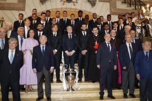 The biggest soccer stars of European football were present, dressed in their formal suits and visibly excited as the trophy was presented to the Virgin as well as when Cardinal Cobo held an official sports T-shirt acknowledging the team’s 15th Champions League title.