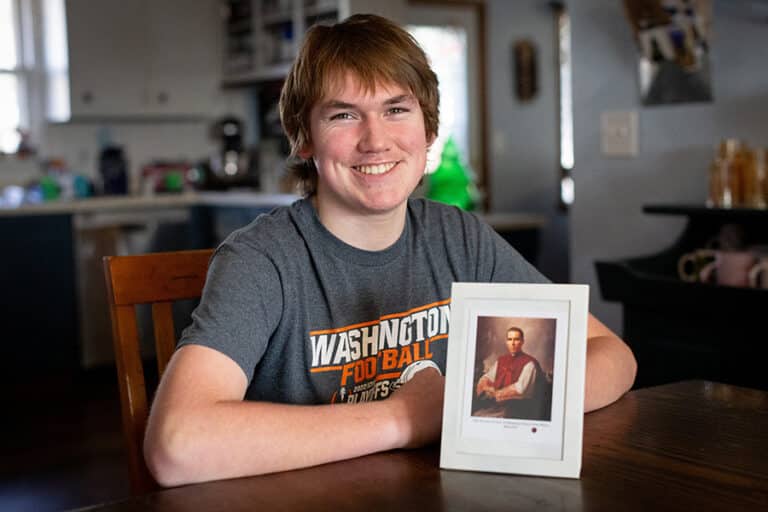 Sheen beatification is back on — and Engstrom family says it will be ‘a little piece of heaven’ February 10, 2026By Jennifer Willems OSV News Filed Under: News, Saints, World News WASHINGTON, Ill. — (OSV News) One of James Fulton Engstrom’s favorite things to do is track the weather, which can be pretty tricky in Central Illinois in the middle of January. The 15-year-old grows excited as he points to his computer and shows the projected snowfall amounts for a recent weekend storm. Another love, although one he keeps closer to his heart, is his relationship with Venerable Fulton J. Sheen, who will take another step toward sainthood when he is beatified. On Feb. 9, Bishop Louis Tylka of Peoria, Ill., announced that the cause for the revered archbishop had been approved to proceed to beatification, and he is working with the Dicastery of the Causes of Saints at the Vatican to determine details. James Engstrom, 15, center, who was born without a pulse on Sept. 16, 2010, and remained clinically dead for 61 minutes before his heart began beating, led to Church-approved miracle that helped advance the cause for Venerable Fulton J. Sheen’s beatification, is pictured with his family at their home in Washington, Ill., Jan. 23, 2026. Pictured next to James are Stephen and his parents, Travis and Bonnie. In back are Teresa, Bennet, Thomas, Joseph, Lydia, Miriam. (OSV News photo/Daryl Wilson) “He’s my protector,” James said of Archbishop Sheen in a recent interview with OSV News. “He was a part of my healing, and I pray to him basically every day.” Born Sept. 16, 2010, James didn’t have a pulse or take a breath for 61 minutes after a planned home birth due to a knot in his umbilical cord. His parents, Bonnie and Travis Engstrom, had entrusted their baby to Fulton Sheen during their pregnancy, and they turned to him now for a miraculous healing through his intercession. Word spread quickly, and people around the Diocese of Peoria — where Archbishop Sheen was ordained a priest in 1919 — and beyond joined the Engstroms in storming heaven with prayer. James’ heart started to beat just as the medical team at OSF Saint Francis Medical Center in Peoria decided they were out of options. The newborn’s healing, which doctors could not explain, was attributed to the intercession of Archbishop Sheen. It became the miracle that cleared the way for his beatification. “It’s pretty cool. I like being the ‘miracle baby,'” James recently told OSV News, adding that having a role in Archbishop Sheen’s sainthood cause makes him feel “special.” “Protector” is a good word for Archbishop Sheen, who has become a close family friend, Bonnie Engstrom shared as she sat in her cozy living room in Washington, Illinois, a nearby suburb of Peoria. In late January, the Christmas tree was still up and likely would be until Candlemas, and there were books everywhere — including a basket of picture books, Bibles and “The Seven Last Words” by Fulton Sheen on the end table. “That’s not staged, honest,” Bonnie said with a laugh. “We were just talking about something in that.” That is a natural part of Engstrom family life and has been since Bonnie and Travis decided to name their son after the theologian, author and media evangelist. His television show “Life Is Worth Living” won the Emmy Award for Most Outstanding Television Personality in 1952, and episodes remain popular on social media today. “From that very beginning I started asking for his intercession, to walk with James his whole life. That was literally my prayer,” Bonnie said. “That is still how I see him, as a figure in James’ life who just loves him for who he is, who wants nothing from him but to love God more, and is someone who is always praying for him.” The couple keeps the conversation going by visiting Archbishop Sheen’s tomb at the Cathedral of St. Mary of the Immaculate Conception in Peoria, reading his books, and talking about him with James and his seven siblings, ages 6 to 17. When it comes to questions about the faith, they often turn for guidance to the Bible, the Catechism of the Catholic Church and Archbishop Sheen. During a recent conversation, Bonnie and her daughter Teresa, 13, talked about their holy friend’s commitment to making a Holy Hour every day from the time he was ordained a priest on Sept. 20, 1919, until he died on Dec. 9, 1979. He was found on the floor of his private chapel, in the presence of the Blessed Sacrament. “Every day, for all of those years, he made a Holy Hour. How long is a Holy Hour?” Bonnie asked. Archbishop Fulton J. Sheen is pictured preaching from a pulpit in an undated file photo. (OSV News file photo, CNS) Teresa responded, “Sixty minutes.” “And James came back to life at 61 minutes,” Bonnie said. “Isn’t that interesting?” While James has had more than his fair share of tests, surgeries and medical emergencies and continues to cope with the aftermath of some of that, he is an active teen who just happened to have something extraordinary happen to him through God’s grace, his family members say. He loves being with his friends at Washington High School, playing basketball and swimming. In ninth grade, he was the team manager and waterboy for the freshman football team last fall, working with his father, who is the offensive coach and teaches physics at the school. “He likes being social — loves being social,” his mom said. “He’ll chat up the players and the cheerleaders and everyone on the side lines.” Among those he encountered was Chris Yates, chief meteorologist at WMBD-TV in Peoria. That conversation resulted in a recent visit to the studio, something James thoroughly enjoyed. As someone who tracks the weather, James loves being outside. He works for a friend from church, mowing and doing yard work. Bonnie said the whole family chips in to help around St. Patrick Church at Mary, Mother of God Parish in Washin