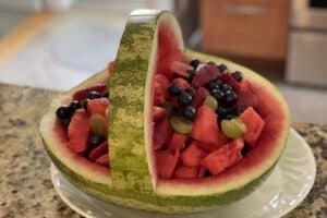 Summer is my favorite time of year, and I am looking forward to being outside more and enjoying longer, slower days. I love everything about summer, even the heat and the humidity. Bring. It. On. And I do love a good watermelon carving, which is why I brought this basket of fruit to an event with friends last weekend.