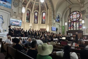 The spirit of that era still lives. Under current director Tony Smalls, the choir continues the tradition of processing in and out during liturgies – tambourines in hand, filling the space with movement and music. The reunion concert honored that tradition as returning members joined current ones, proceeding down the aisles and greeting the audience.