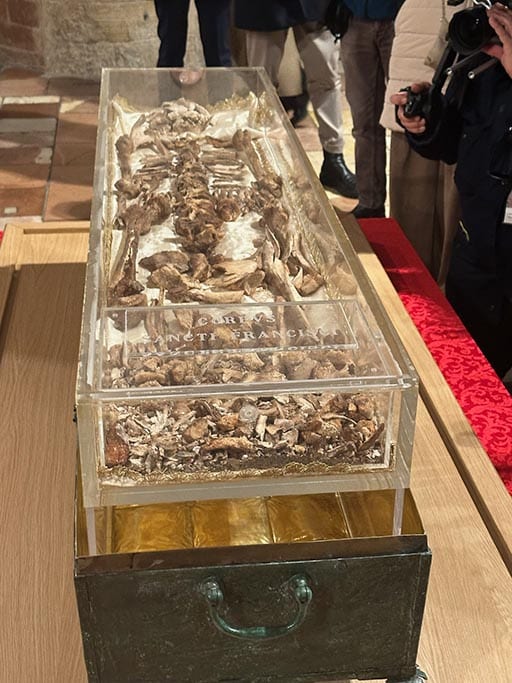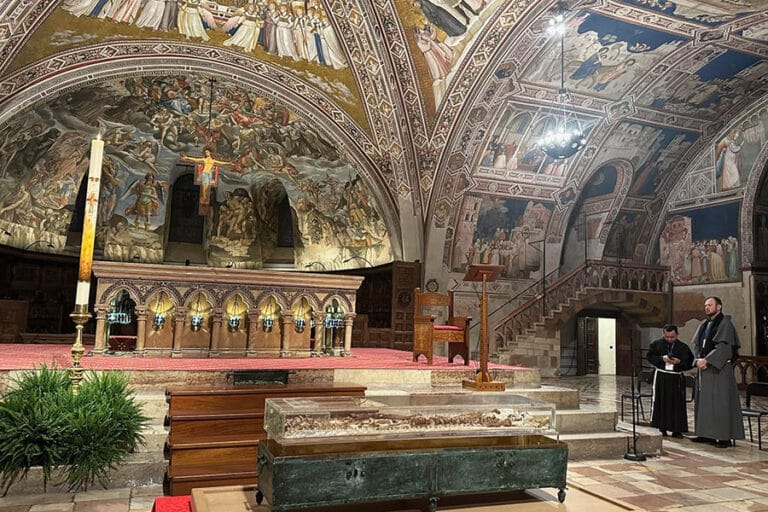St. Francis’ relics open to public for first extended veneration in 800 years February 23, 2026By Courtney Mares OSV News Filed Under: Feature, News, Saints, World News ASSISI, Italy (OSV News) — For the first time in eight centuries, the mortal remains of St. Francis of Assisi are being exposed for an extended period of public veneration, drawing hundreds of thousands of pilgrims from around the world to pray before “the Little Poor Man of Assisi.” The bones of the beloved saint were unveiled for public display Feb. 22 in the Lower Church of the Basilica of St. Francis of Assisi. Pilgrims waited in line outside of the Assisi basilica, taking in the panoramic views of the Umbrian countryside from the medieval hilltop town, for their chance to pray before the relics. The veneration runs through March 22 as part of the Catholic Church’s yearlong celebration of the 800th anniversary of St. Francis’ death in 1226. Heather Martin, an American mother who has lived in Assisi for five years with her family, was among the first pilgrims to venerate the relics. The relics of St. Francis are exposed for veneration in the lower crypt of the Basilica of St. Francis in Assisi, Italy, Feb. 21, 2026. (OSV News photo/Courtney Mares) “St. Francis is by far the most important saint in my life. He’s shown up for me in so many ways and so many dark moments,” she told OSV News. “This experience to be able to go and physically see his physical form has been utterly life-changing.” Martin recalled a conversation she had with one of the Franciscan friars about the experience. “He felt like he was finally meeting a long-lost relative for the first time,” she said. “And I can’t agree with that more.” Fabrizio Ballanti traveled from Ancona, Italy, as part of a care home run by the Focolare movement. “We are a community for people with HIV and AIDS, and we all came together to live this experience,” Ballanti said. Standing before the relics of St. Francis, he said, “I felt the presence of the Lord very strongly,” calling it “a truly powerful experience.” For 21-year-old seminarian Gregory Maloney from the Archdiocese of St. Paul and Minneapolis, the moment was an opportunity to ask St. Francis for the gift of a deeper conversion “to grow in the virtue of poverty.” He said that the long wait in line to view the relics gave him an opportunity to reflect on the life of St. Francis in prayer. “Here is the man who wanted to live poverty as Christ really said it in the Gospel,” Maloney said. “He wanted to give up his whole life, to give up all the things of the world to focus on the pearl of great price … the treasure of heaven.” “And so that was a great encouragement for me then to say, ‘OK, what are the areas in my life I need to give to the Lord? I need to focus more on the things of heaven,” the seminarian added. Franciscan friars opened the sarcophagus to exhume St. Francis’ remains Feb. 21, placing his bones on a specially prepared table in the crypt before carrying them in procession through the Lower Church while praying the Litany of the Saints. Franciscans from across the world participated in a solemn vespers with the exposed relics beneath the basilica’s frescoed ceiling on the evening before the relics opened to the public. Friar Ignacio Ceja Jimenez, a Franciscan friar from Mexico, called it a historic moment of fraternity for all branches of the Franciscan family “because we all recognize ourselves as children of St. Francis, heirs to his charism.” “Seeing and praying before the body of St. Francis also means that we must commit ourselves to living what he lived,” he said. “St. Francis reminds us that the Gospel can not only transform human beings, hearts, but that the Gospel can also transform the structures of our world and help us build a fraternal, peaceful world.” Cardinal Ángel Fernández Artime, the pontifical delegate for the Papal Basilicas of Assisi, presided over both the vespers and the inaugural Mass Feb. 22. The cardinal recalled St. Francis’ final hours on Oct. 3, 1226, in his homily for the Feb. 21 vespers. “When St. Francis felt his death approaching, he asked a friar to read the Gospel to him. Not just any passage, but chapter 13 of John: ‘Before the feast of the Passover, Jesus, knowing that his hour had come … having loved his own who were in the world, he loved them to the end,'” Cardinal Artime said. “His life had been this: a constant listening to the Word, a burning desire to conform himself to the poor and crucified Christ. Service and self-sacrificing love are the heart of Francis’s spirituality.” Brother Jimmy Zammit of Toronto, now based in Rome as general definitor for the Franciscan order, shared his advice for Catholics unable to make the trip to Assisi who want to live out the special Jubilee Year of St. Francis in a particular way. “If our heart becomes more Franciscan, we become makers of peace,” Brother Zammit said. “We seek out to help those who are less fortunate than we are to help the poor, but also to help those who are suffering because they’re feeling isolated and maybe even shunned in some way.” Approximately 370,000 people from five continents have registered to venerate the relics, with Italians making up 80% of registrants. International registrations include 5,000 from the United States, 3,100 from Croatia, 2,000 from Slovakia and 1,500 each from Brazil and France. Some 400 volunteers from dozens of countries are giving of their time to make the monthlong historic event possible. Entry to view St. Francis’ relics is free, but it requires advance registration at saintfrancisliveson.org. The exposition will close with Mass on March 22 in the Upper Church, to be presided over by Cardinal Matteo Maria Zuppi, archbishop of Bologna and president of the Italian Episcopal Conference. “We are experiencing an event of extraordinary grace: For an entire month, in