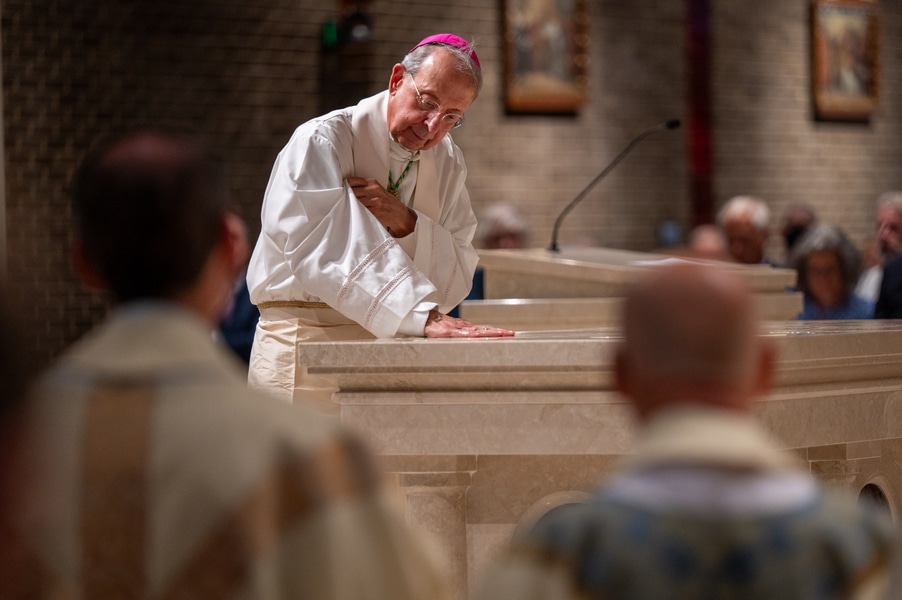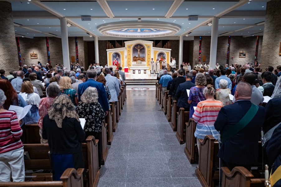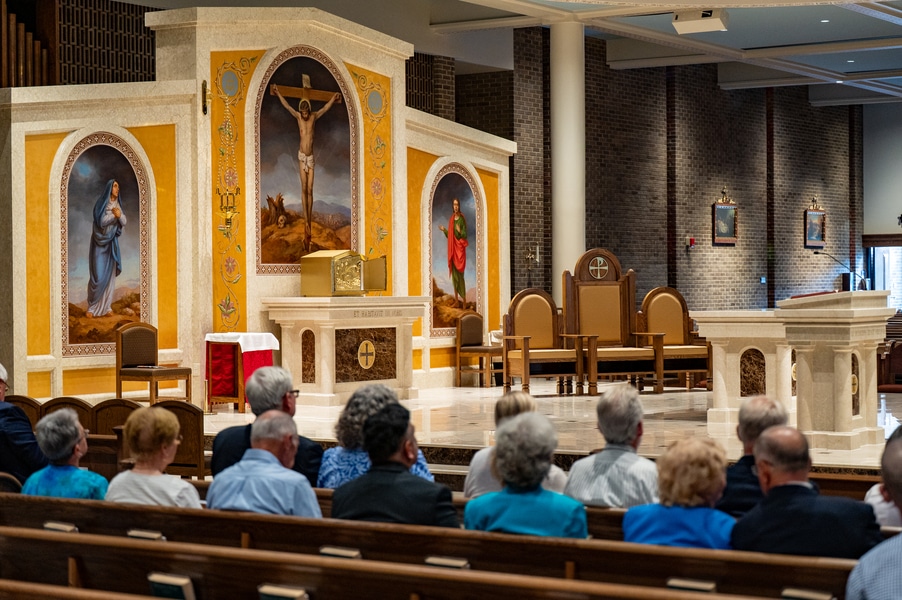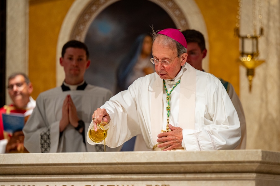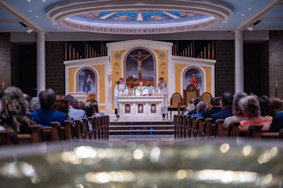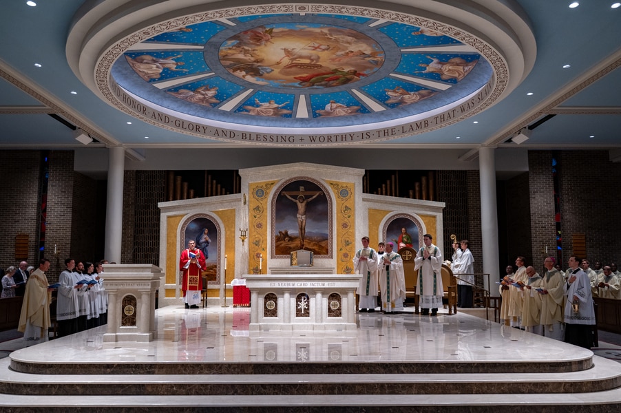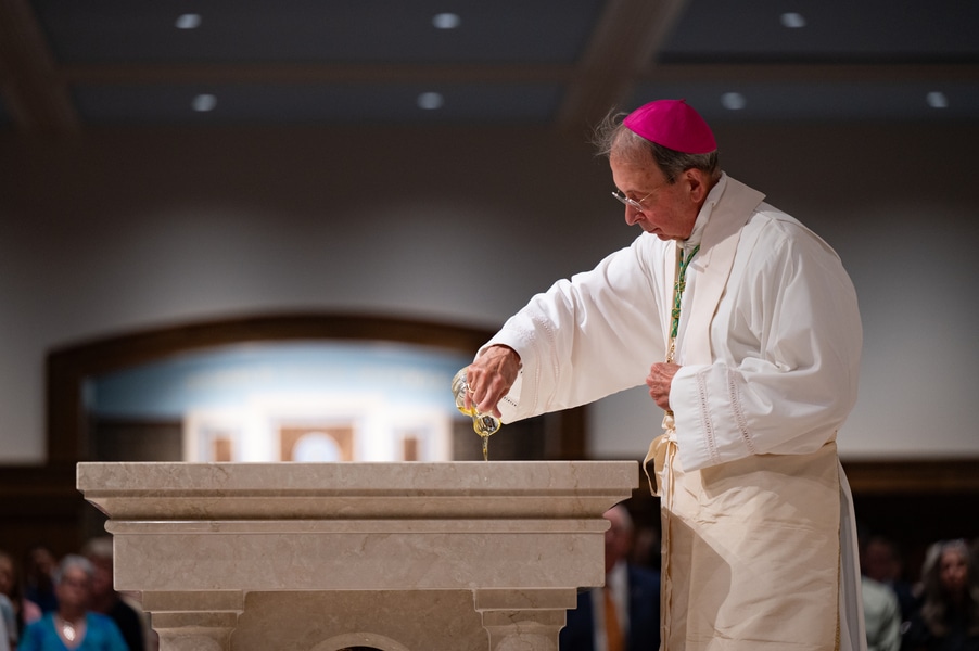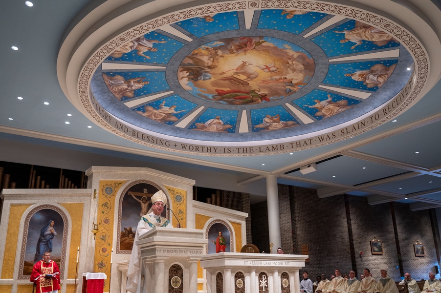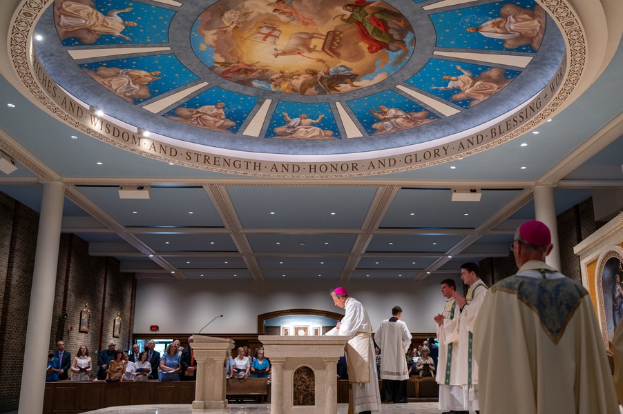 St John the Evangelist in Severna Park celebrates its newly renovated church August 25, 2025By Katie V. Jones Catholic Review Filed Under: Feature, Local News, News SEVERNA PARK – After almost a year of renovations, St. John the Evangelist in Severna Park celebrated its new worship space with more than 800 people attending a solemn Mass of dedication presided by Archbishop William E. Lori. Father Erik Arnold, pastor of St. John the Evangelist Church in Severna Park, sitting second from the right, and Father James Proffitt, former pastor who now heads the clergy personnel division for the Archdiocese of Baltimore, acknowledge one another as the parish applauds during the parish rededication Mass on Aug. 20. (Photo by Kevin J. Parks/CR Staff) “Many of us have followed the renovations of St. John Evangelist Church online. We’ve rejoiced to view electronic images of this church’s transformation. But nothing quite prepared us to walk in today and to witness a church renewed,” Archbishop Lori said in his homily. “The words of the Psalms expressed what we felt as we saw for ourselves the completion of a project so eagerly anticipated. ‘How lovely is your dwelling place.’ How lovely indeed.” Gone is the church’s infamous black ceiling. A shallow dome featuring images of St. John the Evangelist, the Lamb of God and angels in a depiction of a passage from the Book of Revelation, now resides over the altar. The new altar also now has a painted crucifix, with paintings of the Blessed Virgin Mary and St. John the Evangelist on each of its sides. “Since the altar, and indeed this very church, are where the work of God occurs, it is right that we dedicate them to the glory of God,” Archbishop Lori said in his homily. “In this liturgical rite, we do more than just bless the church and altar. We will consecrate them. That is to say, turn them over to God entirely as his possession.” During the Mass, the archbishop blessed parishioners with holy water and placed the relics of the martyrs St. Victorian and companions into the altar where they were then sealed in place. The archbishop then put on a linen apron to first pour and then rub sacred chrism into the altar. Archbishop William E. Lori anoints the new parish altar with chrism during the rededication Mass on Aug. 20. (Kevin J. Parks/CR Staff) “The heart and the center of this beautifully renewed church, is of course, the altar,” Archbishop Lori said in his homily. “What unfolds at this altar is not something we produce, but rather something we receive. Grace following upon grace. It is here where we actually encounter the God who died to save us. It is here, where we are actually saved from our sins. Here, where heaven’s gates are actually opened to us and from this altar we are truly fed with the bread come down from heaven, the Body, Blood, Soul and Divinity of Jesus Christ given for our salvation.” As the smell of incense filled the sanctuary, people stood on their toes and children went into the aisles to watch as smoke rose from a brazier of burning incense that was set in the middle of the altar. Deacons then walked around the sanctuary blessing its walls with the incense. “I am so grateful for our parishioners’ generosity that made it possible,” Father Erik Arnold said afterward, adding that the project was finished not only on time, but on budget – “signs of just how good the Lord was to us.” Parishioners pray during the St. John the Evangelist Church rededication Mass, Aug. 20, in Severna Park. (Kevin J. Parks/CR Staff) While many parishioners remarked on how much brighter the church was without the black ceiling, others enjoyed another benefit from the renovations. “I think they did a beautiful job,” Diana Dinsick, a parishioner at St. John the Evangelist since 2001, said afterward, adding with a chuckle, “The new pews especially. They are more comfortable than the former ones.” Luke Hepler, 12, who presented the gifts during the Mass along with his parents and brother, echoed Dinsick. “I like the new pews. They are way more comfy. The new kneelers, too,” he said, with a smile. Also read: St. John the Evangelist in Severna Park undergoing dramatic renovation To view more photos from the St. John the Evangelist rededication, click through the slideshow below or visit: https://catholicreview.smugmug.com/St-John-the-Evangelist-Dedication Editor’s note: This story was updated at 2:10 p.m. to correct the spelling of Father Erik Arnold’s first name. St. John the Evangelist Church rededication Mass, Aug. 20, in Severna Park. (Kevin J. Parks/CR Staff) St. John the Evangelist Church rededication Mass, Aug. 20, in Severna Park. (Kevin J. Parks/CR Staff) Rowan Layman, a sacristan at St. John the Evangelist Church, lights a stubborn wall candle during the parish rededication Mass Aug. 20. This celebration marked the completion of extensive renovations that were years in the planning for the Severna Park parish. (Kevin J. Parks/CR Staff) St. John the Evangelist Church rededication Mass, Aug. 20, in Severna Park. (Kevin J. Parks/CR Staff) A limited number of parishioners of St. John the Evangelist Church in Severna Park attend their rededication Mass Aug. 20, celebrated by Archbishop William E. Lori, following extensive renovations that coincided with the start of the new school year. (Kevin J. Parks/CR Staff) St. John the Evangelist Church rededication Mass, Aug. 20, in Severna Park. (Kevin J. Parks/CR Staff) St. John the Evangelist Church rededication Mass, Aug. 20, in Severna Park. (Kevin J. Parks/CR Staff) St. John the Evangelist Church rededication Mass, Aug. 20, in Severna Park. (Kevin J. Parks/CR Staff) St. John the Evangelist Church rededication Mass, Aug. 20, in Severna Park. (Kevin J. Parks/CR Staff) Thomas O’Connor, tenor with the St. John the Evangelist Church choir, was one of the featured soloists at the parish rededication Mass Aug. 20, which celebrated the completion of ex