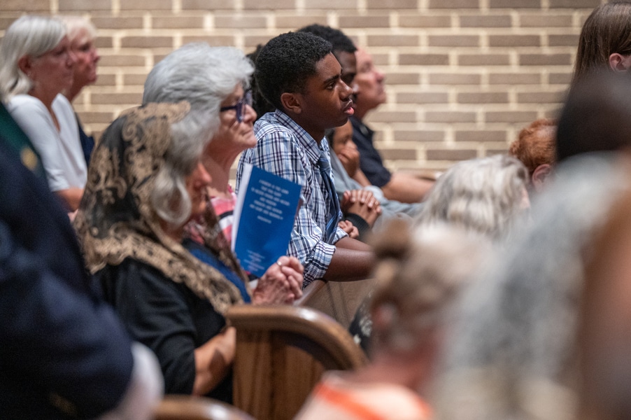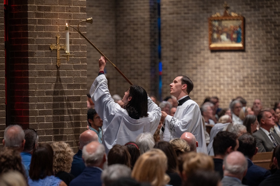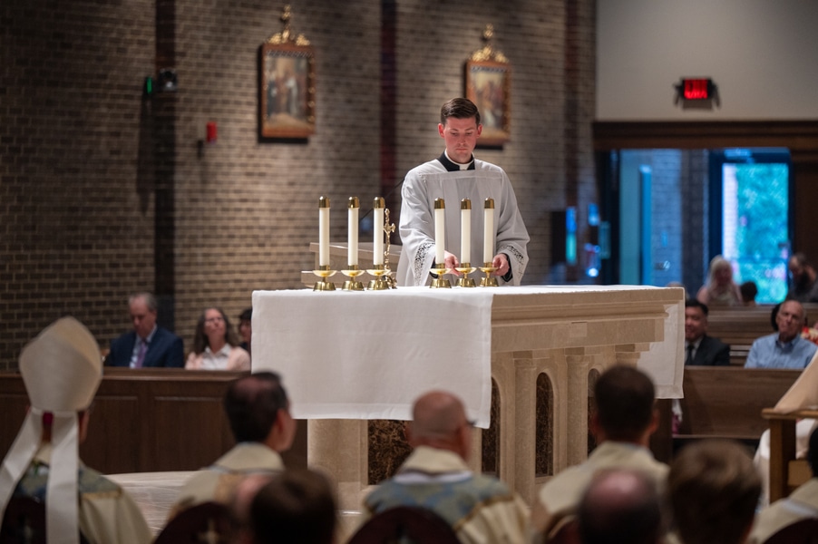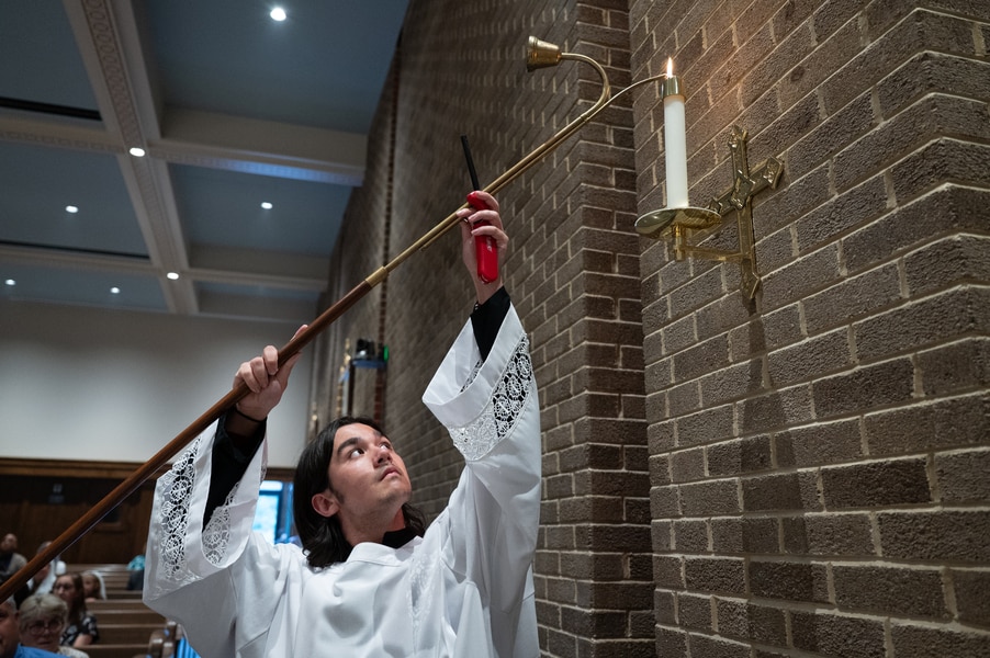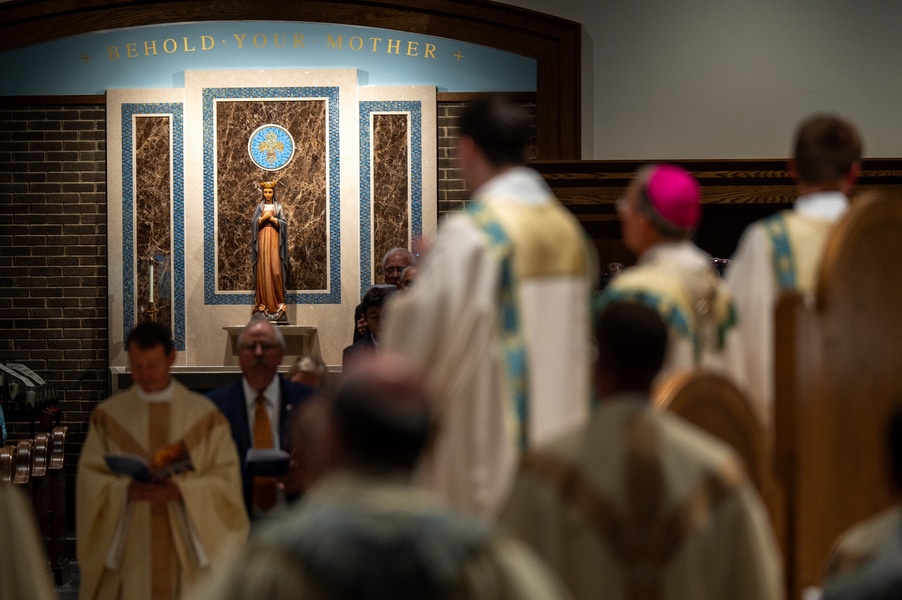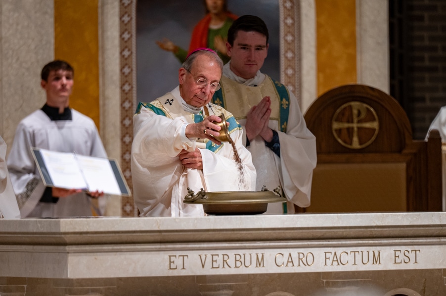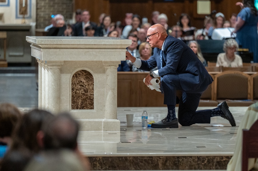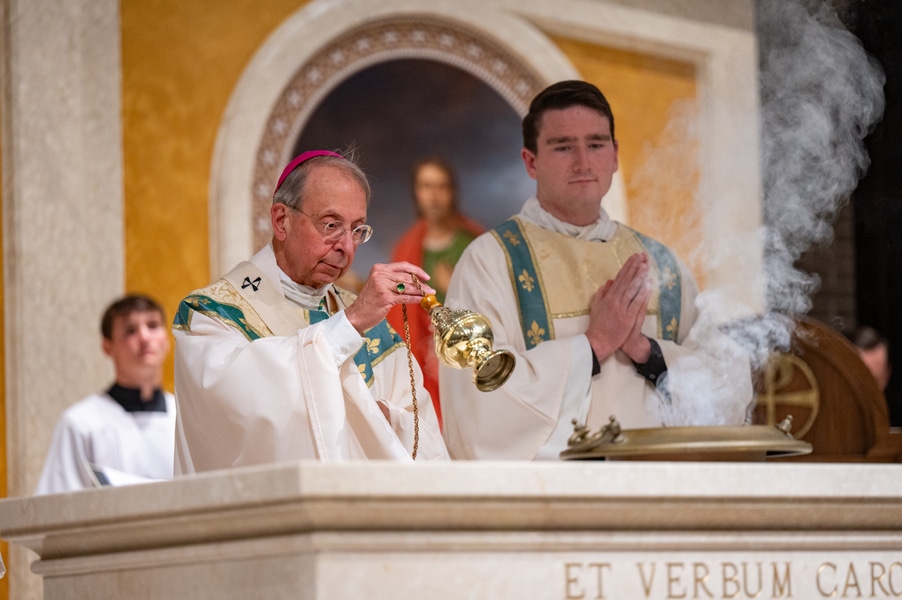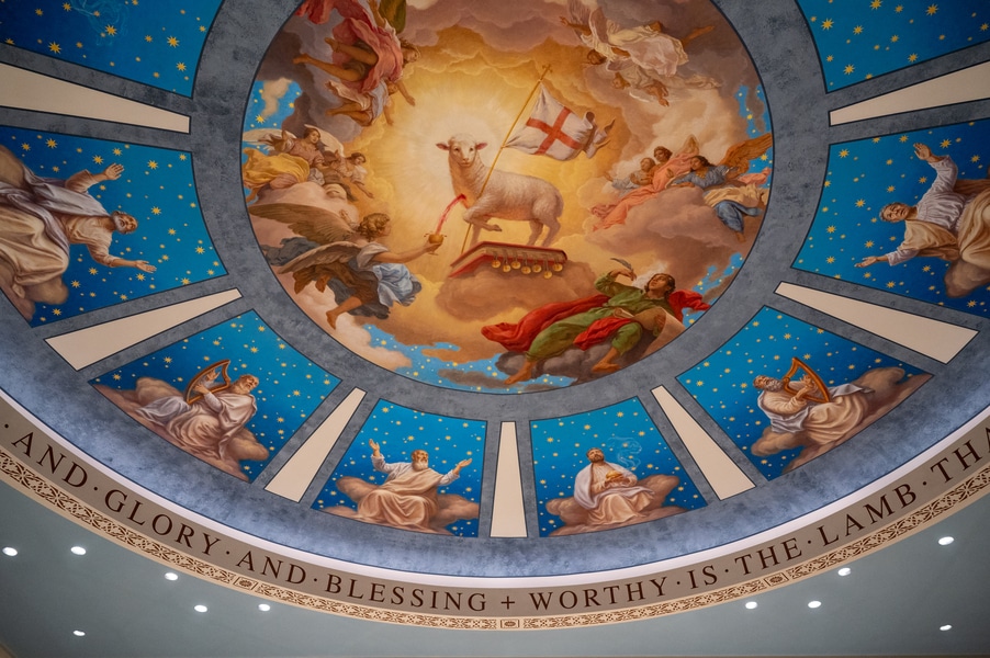 St John the Evangelist in Severna Park celebrates its newly renovated church August 25, 2025By Katie V. Jones Catholic Review Filed Under: Feature, Local News, News SEVERNA PARK – After almost a year of renovations, St. John the Evangelist in Severna Park celebrated its new worship space with more than 800 people attending a solemn Mass of dedication presided by Archbishop William E. Lori. Father Erik Arnold, pastor of St. John the Evangelist Church in Severna Park, sitting second from the right, and Father James Proffitt, former pastor who now heads the clergy personnel division for the Archdiocese of Baltimore, acknowledge one another as the parish applauds during the parish rededication Mass on Aug. 20. (Photo by Kevin J. Parks/CR Staff) “Many of us have followed the renovations of St. John Evangelist Church online. We’ve rejoiced to view electronic images of this church’s transformation. But nothing quite prepared us to walk in today and to witness a church renewed,” Archbishop Lori said in his homily. “The words of the Psalms expressed what we felt as we saw for ourselves the completion of a project so eagerly anticipated. ‘How lovely is your dwelling place.’ How lovely indeed.” Gone is the church’s infamous black ceiling. A shallow dome featuring images of St. John the Evangelist, the Lamb of God and angels in a depiction of a passage from the Book of Revelation, now resides over the altar. The new altar also now has a painted crucifix, with paintings of the Blessed Virgin Mary and St. John the Evangelist on each of its sides. “Since the altar, and indeed this very church, are where the work of God occurs, it is right that we dedicate them to the glory of God,” Archbishop Lori said in his homily. “In this liturgical rite, we do more than just bless the church and altar. We will consecrate them. That is to say, turn them over to God entirely as his possession.” During the Mass, the archbishop blessed parishioners with holy water and placed the relics of the martyrs St. Victorian and companions into the altar where they were then sealed in place. The archbishop then put on a linen apron to first pour and then rub sacred chrism into the altar. Archbishop William E. Lori anoints the new parish altar with chrism during the rededication Mass on Aug. 20. (Kevin J. Parks/CR Staff) “The heart and the center of this beautifully renewed church, is of course, the altar,” Archbishop Lori said in his homily. “What unfolds at this altar is not something we produce, but rather something we receive. Grace following upon grace. It is here where we actually encounter the God who died to save us. It is here, where we are actually saved from our sins. Here, where heaven’s gates are actually opened to us and from this altar we are truly fed with the bread come down from heaven, the Body, Blood, Soul and Divinity of Jesus Christ given for our salvation.” As the smell of incense filled the sanctuary, people stood on their toes and children went into the aisles to watch as smoke rose from a brazier of burning incense that was set in the middle of the altar. Deacons then walked around the sanctuary blessing its walls with the incense. “I am so grateful for our parishioners’ generosity that made it possible,” Father Erik Arnold said afterward, adding that the project was finished not only on time, but on budget – “signs of just how good the Lord was to us.” Parishioners pray during the St. John the Evangelist Church rededication Mass, Aug. 20, in Severna Park. (Kevin J. Parks/CR Staff) While many parishioners remarked on how much brighter the church was without the black ceiling, others enjoyed another benefit from the renovations. “I think they did a beautiful job,” Diana Dinsick, a parishioner at St. John the Evangelist since 2001, said afterward, adding with a chuckle, “The new pews especially. They are more comfortable than the former ones.” Luke Hepler, 12, who presented the gifts during the Mass along with his parents and brother, echoed Dinsick. “I like the new pews. They are way more comfy. The new kneelers, too,” he said, with a smile. Also read: St. John the Evangelist in Severna Park undergoing dramatic renovation To view more photos from the St. John the Evangelist rededication, click through the slideshow below or visit: https://catholicreview.smugmug.com/St-John-the-Evangelist-Dedication Editor’s note: This story was updated at 2:10 p.m. to correct the spelling of Father Erik Arnold’s first name. St. John the Evangelist Church rededication Mass, Aug. 20, in Severna Park. (Kevin J. Parks/CR Staff) St. John the Evangelist Church rededication Mass, Aug. 20, in Severna Park. (Kevin J. Parks/CR Staff) Rowan Layman, a sacristan at St. John the Evangelist Church, lights a stubborn wall candle during the parish rededication Mass Aug. 20. This celebration marked the completion of extensive renovations that were years in the planning for the Severna Park parish. (Kevin J. Parks/CR Staff) St. John the Evangelist Church rededication Mass, Aug. 20, in Severna Park. (Kevin J. Parks/CR Staff) A limited number of parishioners of St. John the Evangelist Church in Severna Park attend their rededication Mass Aug. 20, celebrated by Archbishop William E. Lori, following extensive renovations that coincided with the start of the new school year. (Kevin J. Parks/CR Staff) St. John the Evangelist Church rededication Mass, Aug. 20, in Severna Park. (Kevin J. Parks/CR Staff) St. John the Evangelist Church rededication Mass, Aug. 20, in Severna Park. (Kevin J. Parks/CR Staff) St. John the Evangelist Church rededication Mass, Aug. 20, in Severna Park. (Kevin J. Parks/CR Staff) St. John the Evangelist Church rededication Mass, Aug. 20, in Severna Park. (Kevin J. Parks/CR Staff) Thomas O’Connor, tenor with the St. John the Evangelist Church choir, was one of the featured soloists at the parish rededication Mass Aug. 20, which celebrated the completion of ex
