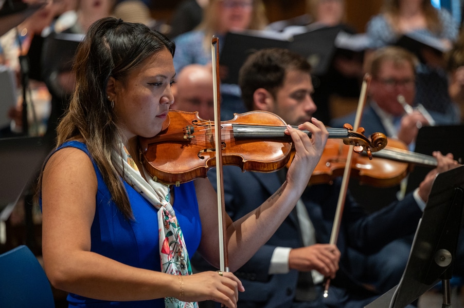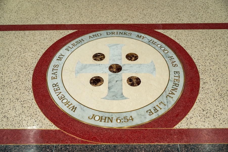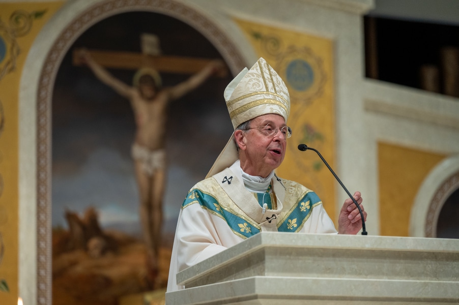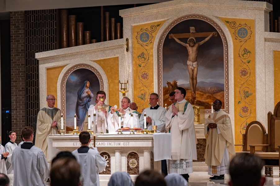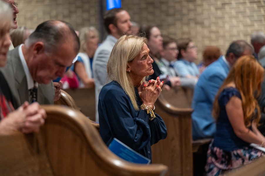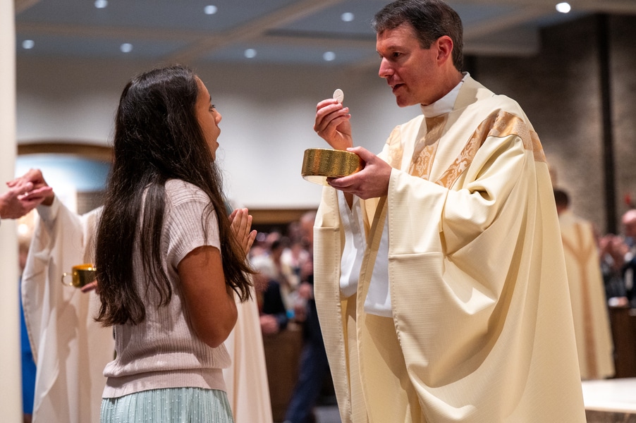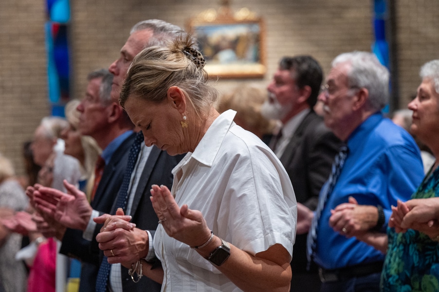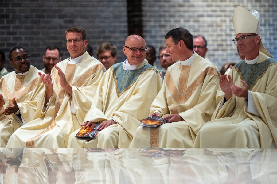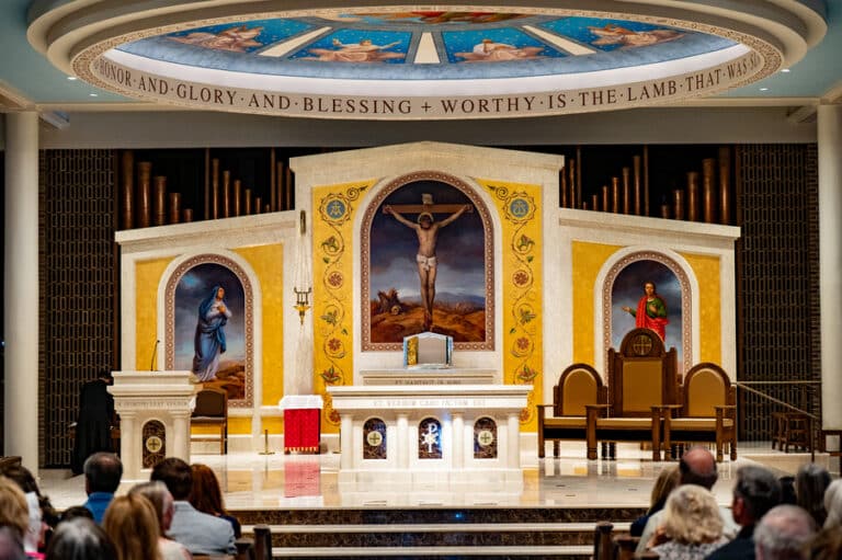 St John the Evangelist in Severna Park celebrates its newly renovated church August 25, 2025By Katie V. Jones Catholic Review Filed Under: Feature, Local News, News SEVERNA PARK – After almost a year of renovations, St. John the Evangelist in Severna Park celebrated its new worship space with more than 800 people attending a solemn Mass of dedication presided by Archbishop William E. Lori. Father Erik Arnold, pastor of St. John the Evangelist Church in Severna Park, sitting second from the right, and Father James Proffitt, former pastor who now heads the clergy personnel division for the Archdiocese of Baltimore, acknowledge one another as the parish applauds during the parish rededication Mass on Aug. 20. (Photo by Kevin J. Parks/CR Staff) “Many of us have followed the renovations of St. John Evangelist Church online. We’ve rejoiced to view electronic images of this church’s transformation. But nothing quite prepared us to walk in today and to witness a church renewed,” Archbishop Lori said in his homily. “The words of the Psalms expressed what we felt as we saw for ourselves the completion of a project so eagerly anticipated. ‘How lovely is your dwelling place.’ How lovely indeed.” Gone is the church’s infamous black ceiling. A shallow dome featuring images of St. John the Evangelist, the Lamb of God and angels in a depiction of a passage from the Book of Revelation, now resides over the altar. The new altar also now has a painted crucifix, with paintings of the Blessed Virgin Mary and St. John the Evangelist on each of its sides. “Since the altar, and indeed this very church, are where the work of God occurs, it is right that we dedicate them to the glory of God,” Archbishop Lori said in his homily. “In this liturgical rite, we do more than just bless the church and altar. We will consecrate them. That is to say, turn them over to God entirely as his possession.” During the Mass, the archbishop blessed parishioners with holy water and placed the relics of the martyrs St. Victorian and companions into the altar where they were then sealed in place. The archbishop then put on a linen apron to first pour and then rub sacred chrism into the altar. Archbishop William E. Lori anoints the new parish altar with chrism during the rededication Mass on Aug. 20. (Kevin J. Parks/CR Staff) “The heart and the center of this beautifully renewed church, is of course, the altar,” Archbishop Lori said in his homily. “What unfolds at this altar is not something we produce, but rather something we receive. Grace following upon grace. It is here where we actually encounter the God who died to save us. It is here, where we are actually saved from our sins. Here, where heaven’s gates are actually opened to us and from this altar we are truly fed with the bread come down from heaven, the Body, Blood, Soul and Divinity of Jesus Christ given for our salvation.” As the smell of incense filled the sanctuary, people stood on their toes and children went into the aisles to watch as smoke rose from a brazier of burning incense that was set in the middle of the altar. Deacons then walked around the sanctuary blessing its walls with the incense. “I am so grateful for our parishioners’ generosity that made it possible,” Father Erik Arnold said afterward, adding that the project was finished not only on time, but on budget – “signs of just how good the Lord was to us.” Parishioners pray during the St. John the Evangelist Church rededication Mass, Aug. 20, in Severna Park. (Kevin J. Parks/CR Staff) While many parishioners remarked on how much brighter the church was without the black ceiling, others enjoyed another benefit from the renovations. “I think they did a beautiful job,” Diana Dinsick, a parishioner at St. John the Evangelist since 2001, said afterward, adding with a chuckle, “The new pews especially. They are more comfortable than the former ones.” Luke Hepler, 12, who presented the gifts during the Mass along with his parents and brother, echoed Dinsick. “I like the new pews. They are way more comfy. The new kneelers, too,” he said, with a smile. Also read: St. John the Evangelist in Severna Park undergoing dramatic renovation To view more photos from the St. John the Evangelist rededication, click through the slideshow below or visit: https://catholicreview.smugmug.com/St-John-the-Evangelist-Dedication Editor’s note: This story was updated at 2:10 p.m. to correct the spelling of Father Erik Arnold’s first name. St. John the Evangelist Church rededication Mass, Aug. 20, in Severna Park. (Kevin J. Parks/CR Staff) St. John the Evangelist Church rededication Mass, Aug. 20, in Severna Park. (Kevin J. Parks/CR Staff) Rowan Layman, a sacristan at St. John the Evangelist Church, lights a stubborn wall candle during the parish rededication Mass Aug. 20. This celebration marked the completion of extensive renovations that were years in the planning for the Severna Park parish. (Kevin J. Parks/CR Staff) St. John the Evangelist Church rededication Mass, Aug. 20, in Severna Park. (Kevin J. Parks/CR Staff) A limited number of parishioners of St. John the Evangelist Church in Severna Park attend their rededication Mass Aug. 20, celebrated by Archbishop William E. Lori, following extensive renovations that coincided with the start of the new school year. (Kevin J. Parks/CR Staff) St. John the Evangelist Church rededication Mass, Aug. 20, in Severna Park. (Kevin J. Parks/CR Staff) St. John the Evangelist Church rededication Mass, Aug. 20, in Severna Park. (Kevin J. Parks/CR Staff) St. John the Evangelist Church rededication Mass, Aug. 20, in Severna Park. (Kevin J. Parks/CR Staff) St. John the Evangelist Church rededication Mass, Aug. 20, in Severna Park. (Kevin J. Parks/CR Staff) Thomas O’Connor, tenor with the St. John the Evangelist Church choir, was one of the featured soloists at the parish rededication Mass Aug. 20, which celebrated the completion of ex