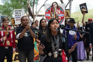 Oak Flat — about 70 miles outside of Phoenix — is considered a sacred site by the region’s Indigenous peoples and is on the National Register of Historic Places. However, after the discovery of copper deposits on the land, in December 2014, Congress authorized the U.S. Forest Service to swap the land for other sites with Resolution Copper and lifted a mining ban on Oak Flat, known by the Apache as Chi’chil Bildagoteel.