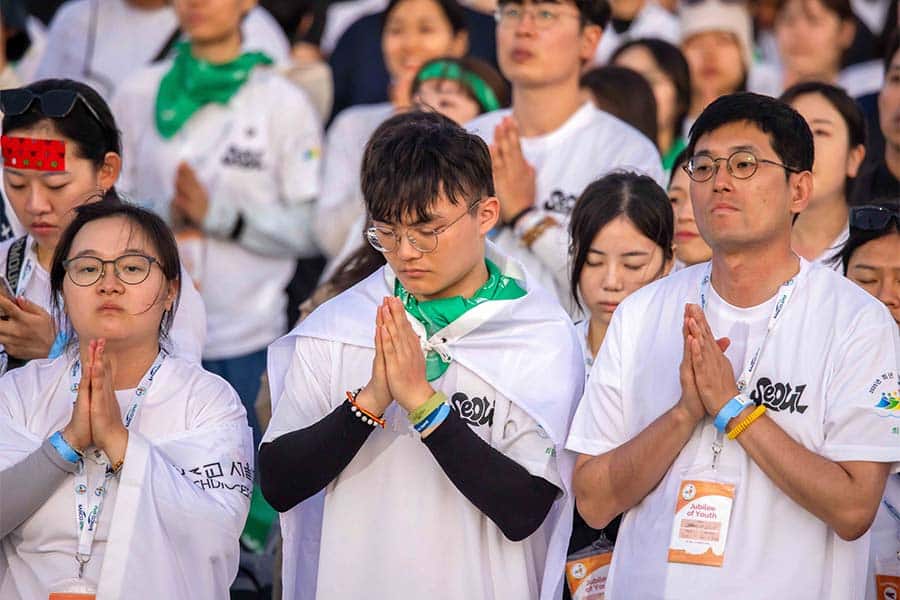 The three questions young people asked Pope Leo XIV — and his answers August 4, 2025By OSV News OSV News Filed Under: Jubilee 2025, News, Vatican, World News, Youth Ministry Pope Leo XIV met with young people from around the world Aug. 2-3, 2025, during the Jubilee of Youth. At a vigil Aug. 2, he addressed an estimated 1 million young people, urging them to forge genuine relationships rooted in Christ rather than ephemeral online connections that can reduce individuals to a commodity. After beginning the vigil with prayers, the pope engaged in a dialogue with several young people who asked him three questions. Here are the questions and answers: Question 1 — Friendship: Holy Father, we are children of our time. We live in a culture that shapes us without our realizing it; it is a culture marked by technology, especially by social media. We often get excited about having lots of friends and creating close relationships, but at the same time we increasingly experience different forms of loneliness. We are close and connected to so many people, yet they are not true and lasting relationships, but rather fleeting and often illusory. Holy Father, my question is: how can we find true friendship and genuine love that will lead us to true hope? How can faith help us build our future? Pilgrims from South Korea pray during a prayer vigil with Pope Leo XIV at Tor Vergata in Rome Aug. 2, 2025. The vigil was part of the Jubilee of Youth celebrations. (CNS photo/Pablo Esparza) Holy Father: Dear young people, relationships with others are essential for each of us, starting with the fact that all men and women in the world are born as someone’s children. Our life begins with a bond, and it is through relationships that we grow. In this process, culture plays a fundamental role: it is like the lens through which we understand ourselves and interpret the world. Just like a dictionary, every culture contains both words that are noble and words that are vulgar, values and also errors that we must learn to recognize. By passionately searching for the truth, we do not merely receive a culture, but also transform it through the choices we make. Truth, in fact, is a bond that connects words to things and names to faces. Lies, on the other hand, divide these elements and lead to confusion and misunderstanding. Among the many cultural connections that characterize our lives, internet and social media have become “an extraordinary opportunity for dialogue, encounter and exchange between persons, as well as access to information and knowledge” (FRANCIS, Christus Vivit, 87). However, these tools are misleading when they are controlled by commercialism and interests that fragment our relationships. In this regard, Pope Francis recalled that sometimes “the whole apparatus of communications, advertising and social networking can be used to lull us, to make us addicted to consumerism” (Christus Vivit, 105). It is then that our relationships become confused, restless or unstable. When a tool controls someone, that person becomes a tool: a commodity on the market and, in turn, a piece of merchandise. Only genuine relationships and stable connections can build good lives. Dear young people, every person naturally desires a good life, just as lungs long for air, but how difficult it is to find it! Centuries ago, Saint Augustine understood the deepest desire of our hearts, even without the technological developments of today. He too had a restless youth, but he did not settle for less, he did not silence the cry of his heart. He sought the truth that does not disappoint and the beauty that does not fade. How did he find it? How did he find true friendship and a love capable of giving hope? By finding the one who was already looking for him, Jesus Christ. How did he build his future? By following the one who had always been his friend. In his own words, friendship is nowhere faithful but in Christ, in whom alone it can be eternal and happy (cf. Against Two Letters of the Pelagians I, I, 1). The one who loves God in his friend, truly loves his friend (cf. Sermon 336). Friendship with Christ, which forms the basis of faith, is not just one aid among many others for building the future; it is our guiding star. According to Blessed Pier Giorgio Frassati, to live without faith, without a patrimony to defend, without a steady struggle for truth, is not living, but existing (cf. Letters, 27 February 1925). It is when our relationships reflect this intense bond with Jesus that they really become sincere, generous and true. Question 2 — The Courage to Choose: Holy Father, our years are marked by important decisions as we are faced with choices that will shape our future. However, due to the climate of uncertainty surrounding us, we are tempted to procrastinate, and we are paralyzed by the fear of an uncertain future. We know that choosing means giving something else up and this becomes an obstacle for us. Despite everything, we sense that hope points to achievable goals, even if they are marked by the precariousness of the present moment. Holy Father, we ask you: where do we find the courage to choose? How can we be courageous and live the adventure of true freedom, making radical and meaningful choices? Holy Father: To choose is a fundamental human act. Looking at it closely, we realize that it is not just a matter of choosing something, but of choosing someone. When we make a choice, in the strict sense, we decide who we want to become. The most important choice is the decision about the direction of our life: What kind of man do you want to be? What kind of woman do you want to be? Dear young people, we learn to choose through the trials of life, but above all by remembering that we have been chosen. This reality must be explored and fostered. We received life as a gift, without choosing it! Our existence did not originate from our decision, but from a love that wanted us. Throughout our lives, those who help us rec