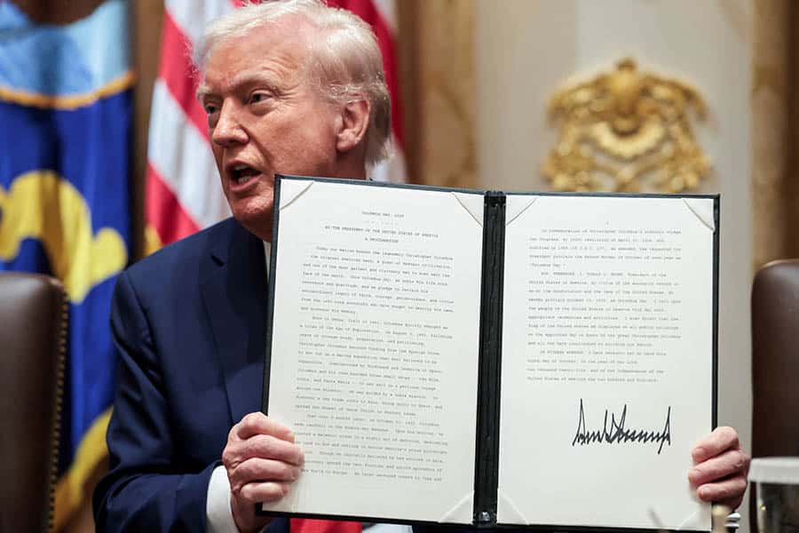 Trump issues Columbus Day proclamation, a holiday established after anti-immigrant violence October 14, 2025By Kate Scanlon OSV News Filed Under: News, World News WASHINGTON (OSV News) — President Donald Trump issued a proclamation for Columbus Day, a holiday first created in the aftermath of deadly anti-immigrant violence. President Benjamin Harrison proclaimed Oct. 21, 1892, as the first national Columbus Day to celebrate the 400th anniversary of Columbus’ exploration of America. The proclamation, which he originally intended as a one-time event, came in the wake of a riot the previous year in New Orleans, when 11 Italian Americans were lynched in a xenophobic attack. U.S. President Donald Trump holds an executive order about Columbus Day during a Cabinet meeting at the White House in Washington Oct. 9, 2025. In the proclamation he signed ahead of the Oct. 13 holiday, he called Christopher Columbus “the original American hero, a giant of Western civilization, and one of the most gallant and visionary men to ever walk the face of the earth.” (OSV News photo/Evelyn Hockstein, Reuters) Columbus Day became a permanent national holiday in 1934 after Congress authorized President Franklin D. Roosevelt to declare the federal holiday, which came after advocacy from the Knights of Columbus. Some jurisdictions have chosen to replace or add to the holiday Indigenous Peoples Day, aimed at honoring native American cultures amid concerns over Christopher Columbus’ ties to colonization and violence against Indigenous peoples. Former President Joe Biden recognized both titles for the federal holiday in 2021. Trump previously said in an April social media post that he would bring back Columbus Day “from the ashes.” In a proclamation Trump signed Oct. 9, ahead of the Oct. 13 holiday, he called Christopher Columbus “the original American hero, a giant of Western civilization, and one of the most gallant and visionary men to ever walk the face of the earth.” “This Columbus Day, we honor his life with reverence and gratitude, and we pledge to reclaim his extraordinary legacy of faith, courage, perseverance, and virtue from the left-wing arsonists who have sought to destroy his name and dishonor his memory,” it said. In the proclamation, Trump added, “Outrageously, in recent years, Christopher Columbus has been a prime target of a vicious and merciless campaign to erase our history, slander our heroes, and attack our heritage.” “As we celebrate his legacy, we also acknowledge the contributions of the countless Italian-Americans who, like him, have endlessly contributed to our culture and our way of life,” the proclamation said. At the Oct. 9 signing ceremony, Trump said, “We’re back, Italians.” “We love the Italians,” he said. According to the Pew Research Center, 30 states and three U.S. territories recognize Columbus Day in some form, while five states and American Samoa share both titles for the holiday. Maine, Vermont, New Mexico and the District of Columbia replaced Columbus Day with Indigenous Peoples Day, while Delaware marks a floating state holiday. Read More World News Though Nicaea is a ruin, its Creed stands and unites Christians, pope says A little leaven can do great things, pope tells Turkey’s Catholics Diocese of Hong Kong mourns over 100 victims of devastating apartment complex fire Catholic filmmaker investigates UFO mysteries at the Vatican ‘The Sound of Music’ at 60 Tennessee teen’s letter to Pope Leo brings a reply with gift of special rosary blessed by him Copyright © 2025 OSV News Print