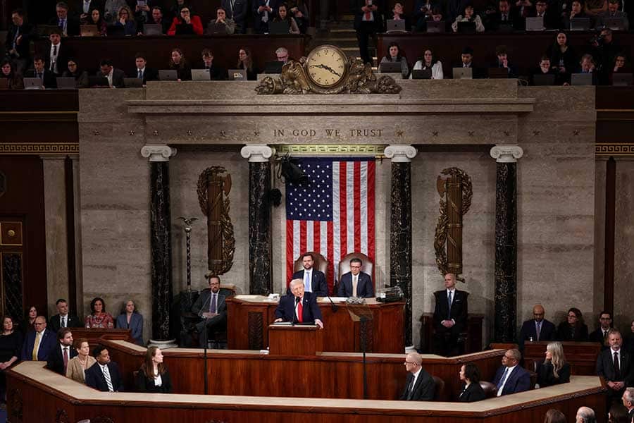 Trump touts immigration enforcement in State of the Union address as polls show growing concern February 25, 2026By Kate Scanlon OSV News Filed Under: Feature, Immigration and Migration, News, Religious Freedom, World News WASHINGTON (OSV News) — President Donald Trump touted his administration’s immigration enforcement actions in his Feb. 24 State of the Union address, as polls show increasing concern about these policies among U.S. voters. In the first State of the Union Address of his second term — he previously delivered an address to a joint session of Congress in March 2025 — Trump touted his immigration policy in a pitch to midterm voters for his fellow Republicans. But the speech comes as more U.S. adults grow skeptical of aspects of his immigration policy. Trump’s comments largely centered around border security, rather than deportation. U.S. President Donald Trump delivers his State of the Union address at the Capitol in Washington Feb. 24, 2026. (OSV News photo/Kenny Holston pool via Reuters) A trio of national polls released in February found majorities of Americans said enforcement actions by U.S. Immigration and Customs Enforcement, or ICE, have gone too far, or found that minority shares said they approve of Trump’s handling of immigration. In his speech, Trump touted what he called “the strongest and most secure border in American history,” but said “we will always allow people to come in legally, people that will love our country and will work hard to maintain our country.” But Trump did not depart from a hardline tone, arguing, “The only thing standing between Americans and a wide-open border right now is President Donald J. Trump and our great Republican patriots in Congress.” Trump told members in the chamber to stand for the phrase “the first duty of the American government is to protect American citizens, not illegal aliens,” and said members who did not “should be ashamed.” In a statement issued hours before the speech, a group of U.S. bishops urged several reforms to immigration enforcement, including ensuring families of mixed immigration status are not separated, citing the unnecessary harm done to their children, and that sensitive locations such as houses of worship, schools and hospitals are protected from enforcement actions. With four of nine Supreme Court justices in attendance, Trump called the court’s recent decision striking down his sweeping tariff policy a “very unfortunate ruling.” The ruling found Trump exceeded his authority in issuing the tariffs, marking a major setback for his economic agenda. In effect, a tariff is a tax imposed by a government on imported goods. Trump has argued his tariffs would protect U.S. manufacturing, but some economists have cautioned they will raise consumer prices on many goods and could lead to a recession. Catholic economists, pointing out the Church’s preferential option for the poor in its social teaching, have also pointed out the burden of those tariffs disproportionately falls on Americans with the lowest incomes. Trump also endorsed a ban on members of Congress trading stocks, as bipartisan legislation to restrict members from trading has stalled in the House. Elsewhere in the speech, Trump called for a ban on medical or surgical gender reassignment procedures for minors who identify as transgender. The U.S. bishops in November approved an updated version of “Ethical and Religious Directives for Catholic Health Care Services,” their guiding document on Catholic health care, with substantial revisions that include explicit prohibitions against such surgeries. U.S. President Donald Trump delivers his State of the Union address at the Capitol in Washington Feb. 24, 2026. (OSV News photo/Kevin Lamarque, Reuters) Trump also spoke about his efforts to increase access to in vitro fertilization, mentioning Catherine Rayner, a military spouse and the first user of TrumpRx, who was in the audience, and how she used the site to access more affordable drugs for the treatment. IVF is a form of fertility treatment opposed by the Catholic Church on the grounds that it often involves the destruction of human embryos, among other concerns. “We are all praying for you, and you’re going to be a great mom,” he told her. Delivering a Democratic rebuttal to Trump’s speech from Colonial Williamsburg’s historic area in Virginia, Gov. Abigail Spanberger, D-Va., argued that “we did not hear the truth from our president” about his record from his first year in office, pointing to the economy. “Let’s speak plainly and honestly, and let me ask you, the American people watching at home, three questions: Is the president working to make life more affordable for you and your family? Is the president working to keep Americans safe, both at home and abroad? Is the president working for you?” she asked. Some Democratic members of Congress boycotted the event in protest of Trump, instead attending an event on the National Mall dubbed the “People’s State of the Union.” Rep. Al Green, D-Texas, was escorted from the chamber while carrying a sign that said “Black people aren’t apes,” an apparent reference to a video posted on Trump’s Truth Social account that depicted former first couple President Barack and Michelle Obama as apes that was deleted after widespread outrage denounced the content as racist. While not explicitly prohibited, House decorum rules are generally understood to limit signs and props on the floor. But in one moment of bipartisanship, Trump awarded E. Royce Williams, a 100-year-old retired Navy captain, the Congressional Medal of Honor for his actions in a mission during the Korean War, to widespread applause in the chamber. Notable guests included Claire Lai, an attorney and the daughter of Jimmy Lai, Hong Kong’s prominent Catholic media tycoon and pro-democracy campaigner, who was recently sentenced to 20 years in prison after being convicted of of