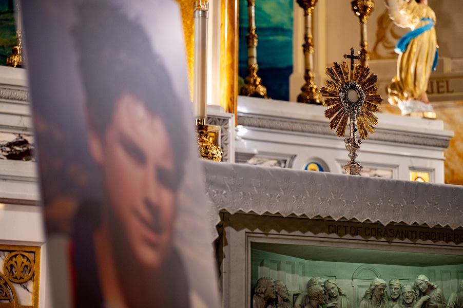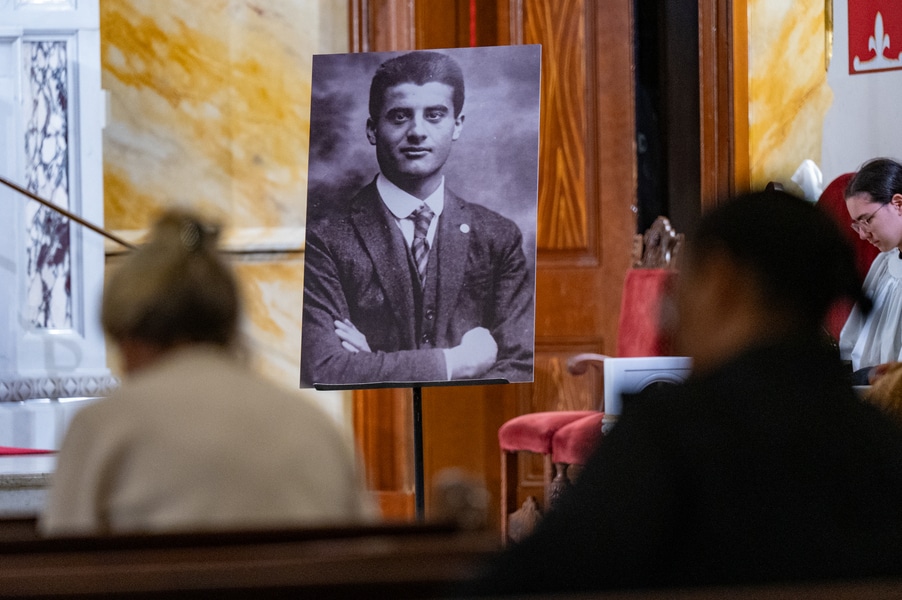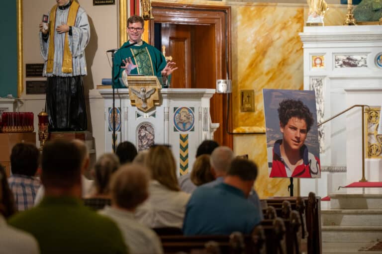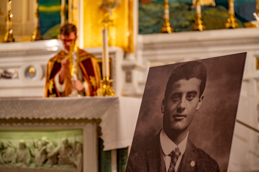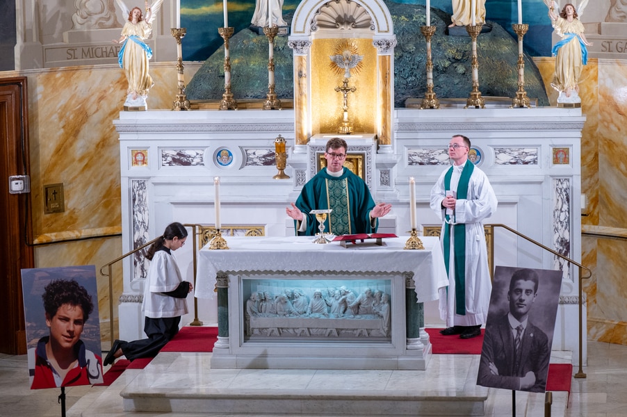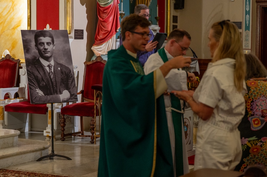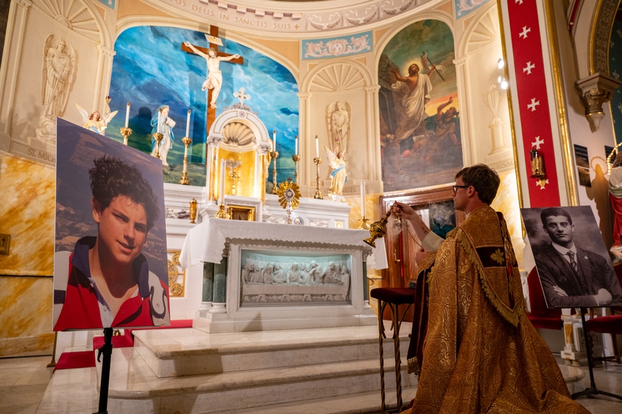 Two new saints celebrated by Baltimore Catholics September 8, 2025By Katie V. Jones Catholic Review Filed Under: Feature, Local News, News, Saints Baltimore Catholics joined the worldwide Catholic community in honoring two young saints this weekend as Carlo Acutis, a 15-year-old computer whiz who died in 2006, and Pier Giorgio Frassati, a 24-year-old rock climber who died in 1925, were canonized Sept. 7 by Pope Leo XIV in St. Peter’s Square. Father Evan Ponton, pastor of St. Leo the Great Roman Catholic Church in Little Italy, blesses the monstrance with incense to commence eucharistic adoration following their Sept. 6 parish Mass, which was dedicated St. Carlo Acutis, left, and St. Pier Giorgio Frassati. The pair were canonized by Pope Leo XIV in Rome on Sept. 7. (Kevin J. Parks/CR Staff) Both faith-filled and handsome, the two saints were celebrated across the Archdiocese of Baltimore with special Masses, dinners and opportunities for veneration. In Baltimore’s Little Italy, Father Evan Ponton, pastor of St. Leo the Great, welcomed more than 100 people to an evening Mass Sept. 6, followed by eucharistic adoration and an Italian dinner featuring Father Leo Patalinghug’s Plating Grace food truck. With photos of the saints prominently displayed at the front of the church, Father Ponton admitted in his homily that he had been praying to Carlo Acutis many times in recent months for help with computers – from fixing the Wi-Fi to keeping the printer working. “We are all hardwired to run the ‘Christ program,’” he said. “All of us need a bit of conversion or reprogramming at times to become compatible with Christ,” Father Ponton said. “Your identity in Christ can never be stolen. It is already created for you. It was given to you. The saints, like Carlo and Pier, show us true authenticity. They show us the program and the process to becoming truly ourselves.” During adoration, music filled the church while people prayed to the new saints and confessions were heard. Students from Towson University meet with Wanda Gawronska, Saint Pier Giorgio Frassati’s niece, in Rome, August 2025. (Courtesy photo) “It is such a joyous occasion to be able to bring my children to this celebration for saints who are very relatable to their young lives,” said Christina Tine, a parishioner of St. John the Evangelist in Severna Park, as she waited in line at the Plating Grace food truck with her two daughters. The Schneider family – Mark, Kathleen and son Josh – parishioners at St. Margaret in Bel Air, traveled to Italy in August on a pilgrimage that took them to the mountains where St. Pier Giorgio hiked, to his hometown of Turin, and to Rome, where his body was on display. They had hoped to attend his canonization Aug. 3, but the ceremony was rescheduled following the death of Pope Francis in April. “I saw this and thought, coming here makes it full circle,” Mark said. Students from Towson University’s Newman Center also traveled to Italy this summer. Four of them, along with campus minister Brian Rhude, met Wanda Gawronska, St. Pier Giorgio’s niece and a promoter for his canonization. A portrait of St. Pier Giorgio Frassati stands below a statue of Jesus, while Christopher Rhodovi, director of music at St. Leo the Great Roman Catholic Church, leads parishioners in music for the late-afternoon Mass Sept. 6 in Little Italy. The Mass was dedicated to both Frassati and Saint Carlo Acutis, who were canonized by Pope Leo XIV in Rome Sept. 7. (Kevin J. Parks/CR Staff) “Just being in the room, just seeing her, it was very, very beautiful,” said Lucia Gurri, 21, a junior at Towson. “She is very quick, very sharp. It was really lovely meeting her. It makes you think these people are so real. These people were like you and me.” Mackenzie Gorczyca, 19, a sophomore, commented on all the photos of St. Pier Giorgio in Gawronska’s apartment, and the stories she told. “She was so proud to be his niece. She just wanted to share all the amazing things about him,” Gorczyca said. “You could see how Christ worked in his life through Wanda.” Gurri also admired St. Pier Giorgio’s courage. “He was someone who wasn’t afraid to totally submit to the Lord’s calling to him,” Gorczyca said. In Crofton, St. Elizabeth Ann Seton displayed its first-class relic of St. Carlo during weekend Masses. The lock of hair was given to the church after parishioners petitioned for a relic following a previous loan for a display about St. Carlo, according to Deacon Michael Fitzpatrick. As relics cannot be mailed, a visiting seminarian from the Diocese of Arlington transported it to the parish. “That’s how it happened,” Deacon Fitzpatrick said. “I didn’t realize you had to petition for a relic. I knew they were hard to come by.” St. Elizabeth Ann Seton’s newly formed youth group was able to view the relic, Deacon Fitzpatrick said. “We got to talking about relics and how Carlo’s love of the Eucharist led him to this great thing he did for us, a website about the Eucharist,” Deacon Michael said. “To have teenagers hear it and get it and say ‘Wow,’ I think we make him a ‘go-to saint.’” Email Katie V. Jones at kjones@CatholicReview.org To view more photos of Baltimore-area Catholics celebrating the canonizations of two new saints, click through the slide show below: St. Leo the Great Roman Catholic Church, Little Italy, Sept. 6 parish Mass, dedicated St. Carlo Acutis, and St. Pier Giorgio Frassati. The pair were canonized by Pope Leo XIV in Rome on Sept. 7. (Kevin J. Parks/CR Staff) St. Leo the Great Roman Catholic Church, Little Italy, Sept. 6 parish Mass, dedicated St. Carlo Acutis, and St. Pier Giorgio Frassati. The pair were canonized by Pope Leo XIV in Rome on Sept. 7. (Kevin J. Parks/CR Staff) During the Saturday afternoon Mass on Sept. 6, Father Evan Ponton, pastor of St. Leo the Great Roman Catholic Church in Little Italy, and Father Thomas P. O’Donnell,