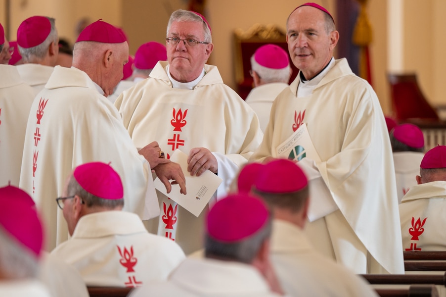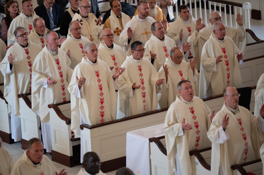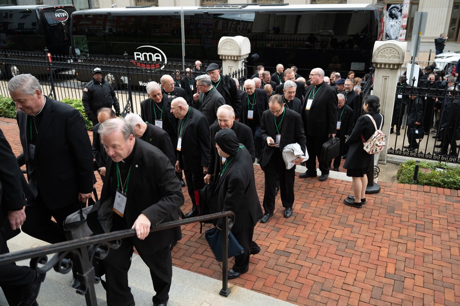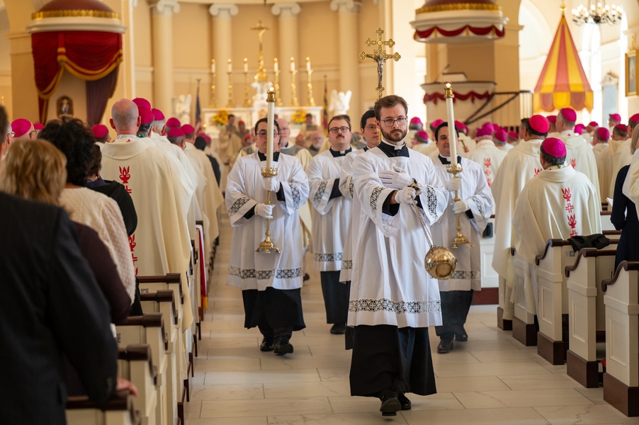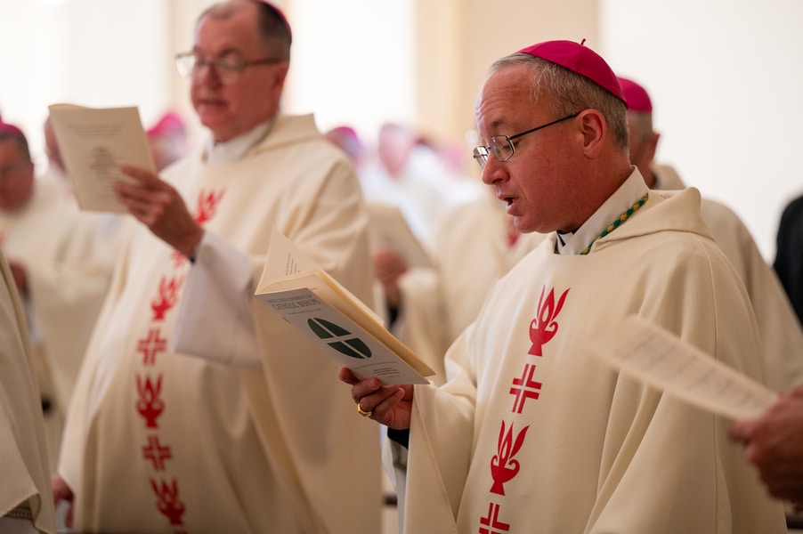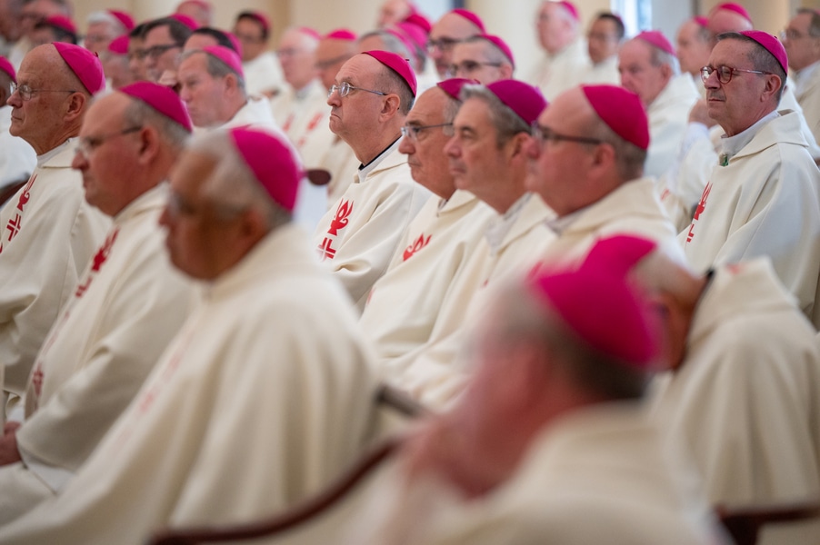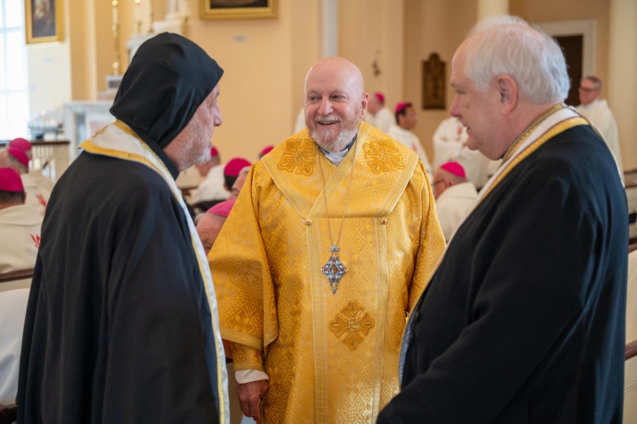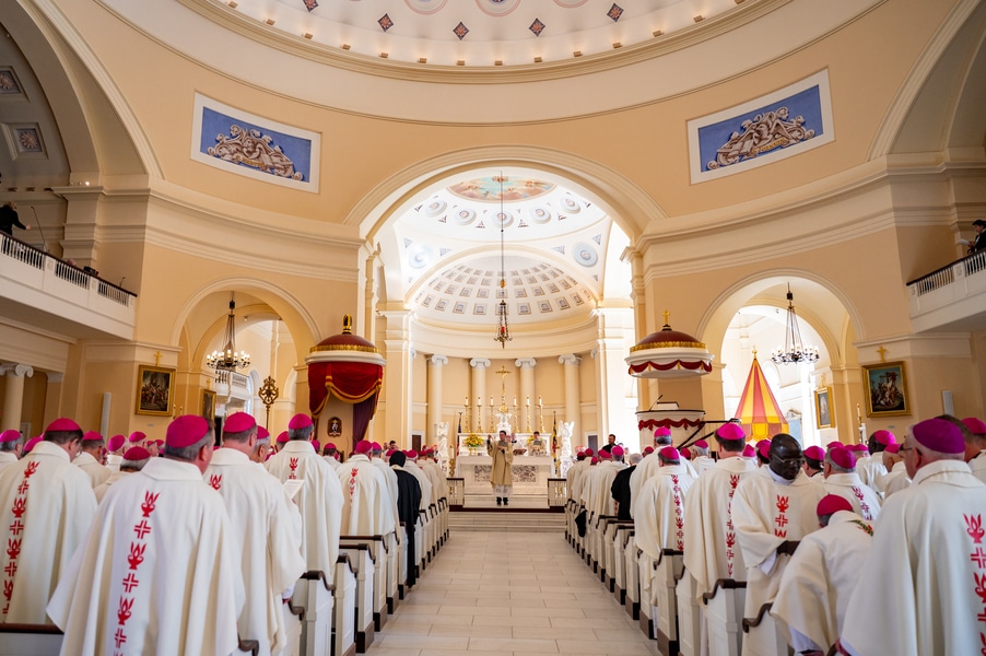 U.S. bishops celebrate Mass to ‘beg the Holy Spirit to inspire’ November 10, 2025By Katie V. Jones Catholic Review Filed Under: Bishops, Local News, News En Español Arriving by motor coaches, more than 320 bishops from across the United States streamed into the Basilica of the National Shrine of the Assumption of the Blessed Virgin Mary in Baltimore Nov. 10, where they donned matching vestments to celebrate Mass on the first day of their annual fall plenary assembly. Archbishop Gregory Hartmayer of the Diocese of Atlanta, left, walks alongside his fellow bishops as they enter the Basilica of the National Shrine of the Assumption of the Blessed Virgin Mary. (Kevin J. Parks/CR Staff) “A very, very warm welcome to everyone this morning,” Baltimore Archbishop William E. Lori, vice president of the U.S. Conference of Catholic Bishops, said in his opening remarks. “This is a beautiful church, an ancient church. It is a historic church, but I think the most beautiful thing about this church is that it is a living, breathing community of mostly young adults who love the Lord.” In his homily, Archbishop Timothy P. Broglio, USCCB president and archbishop of the Archdiocese for the Military Services, USA, noted that at the beginning of the sessions, the bishops “beg the Holy Spirit to inspire” their deliberations and “renew their duty to be servants of truth.” Archbishop William E. Lori of Baltimore welcomes his fellow bishops to the Basilica of the National Shrine of the Assumption of the Blessed Virgin Mary. (Kevin J. Parks/CR Staff) He spoke of the many distractions people face in the world today. He told of meeting a young airman at Fort Meade who asked him “how to be a saint” and where he could find the courage to live by his convictions of faith. “I confess that I was moved by the sincerity of his question,” Archbishop Broglio said. “For me, it was a moment of hope. A young man … seeking ways to deepen his grasp on truth.” The way forward tends to be self indulgent, he said. The Gospel, he said, “does urge us to be demanding of ourselves” but asks us to “be eager to forgive the other when he or she asks for forgiveness. Help us listen.” An estimated 320 bishops from across the United States attend the opening Mass for the 2025 fall plenary. (Kevin J. Parks/CR Staff) The priority in the house of prayer is the worship of God, he said, and “not the motivation of other gods.” During the assembly, which runs through Nov. 13, the bishops are expected to talk about numerous issues, hold elections and discuss policies. Auxiliary Bishop James Massa, of the Diocese of Brooklyn, noted that the first day of the conference was a time for reflection with Mass as well as confessions and adoration scheduled to allow the bishops to quiet their own struggles in order to be open and willing. “Immigration is top on the agenda,” Bishop Massa said. “It is a time of transition. We are electing a new president and vice president. We need the grace of the Holy Spirit.” Bishop Bruce A. Lewandowski, C.Ss.R., former auxiliary bishop of Baltimore and now the leader of the Diocese of Providence, R.I., is warmly greeted by Adrienne Curry, director of the Archdiocese of Baltimore’s Office of Black Catholic Ministries. (Kevin J. Parks/CR Staff) “The meeting in Baltimore each year is a very important one,” said Bishop Robert M. Pipta of the Byzantine Catholic Eparchy of Parma. “The Eastern Catholic bishops are very much a part of this. We learn. We pray for one another. We really try to face some of the very real challenges in our country right now when it comes to not only our people, but all people of good well.” “When you see the church in diversity and unity, and Christ is proclaimed East and West, it’s beautiful,” Bishop Gregory Mansour, of the Eparchy of St. Maron of Brooklyn, said. For Diocese of Providence Bishop Bruce A. Lewandowski, C.Ss.R., the conference was a homecoming as he was previously an auxiliary bishop of Baltimore until his appointment to Rhode Island in May 2025. “The thing I’m looking forward to most about the conference this time around is being in Baltimore and seeing the people I love,” he said, between hugs and well wishes. Email Katie V. Jones at kjones@CatholicReview.org To view more photos from this event, click through the slideshow below: Opening Mass at the Basilica of the National Shrine of the Assumption of the Blessed Virgin Mary for the fall plenary of the U.S. Conference of Catholic Bishops Nov. 10 in Baltimore. (Kevin J. Parks/CR Staff) Opening Mass at the Basilica of the National Shrine of the Assumption of the Blessed Virgin Mary for the fall plenary of the U.S. Conference of Catholic Bishops Nov. 10 in Baltimore. (Kevin J. Parks/CR Staff) Opening Mass at the Basilica of the National Shrine of the Assumption of the Blessed Virgin Mary for the fall plenary of the U.S. Conference of Catholic Bishops Nov. 10 in Baltimore. (Kevin J. Parks/CR Staff) Opening Mass at the Basilica of the National Shrine of the Assumption of the Blessed Virgin Mary for the fall plenary of the U.S. Conference of Catholic Bishops Nov. 10 in Baltimore. (Kevin J. Parks/CR Staff) Opening Mass at the Basilica of the National Shrine of the Assumption of the Blessed Virgin Mary for the fall plenary of the U.S. Conference of Catholic Bishops Nov. 10 in Baltimore. (Kevin J. Parks/CR Staff) Opening Mass at the Basilica of the National Shrine of the Assumption of the Blessed Virgin Mary for the fall plenary of the U.S. Conference of Catholic Bishops Nov. 10 in Baltimore. (Kevin J. Parks/CR Staff) Opening Mass at the Basilica of the National Shrine of the Assumption of the Blessed Virgin Mary for the fall plenary of the U.S. Conference of Catholic Bishops Nov. 10 in Baltimore. (Kevin J. Parks/CR Staff) Opening Mass at the Basilica of the National Shrine of the Assumption of the Blessed Virgin Mary for the fall plenary of the U.S. Conference of Cat