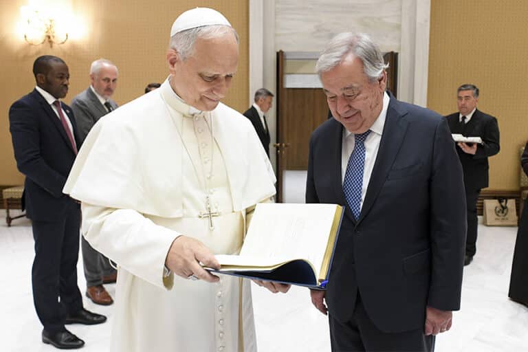 UN secretary-general meets Pope Leo, top Vatican officials June 11, 2025By Carol Glatz Catholic News Service Filed Under: News, Vatican, World News VATICAN CITY (CNS) — Pope Leo XIV met with U.N. Secretary-General António Guterres during a private audience at the Vatican June 11. The meeting with the U.N. chief took place in the pope’s study in the Paul VI Audience Hall before the pope’s morning general audience in St. Peter’s Square, the Vatican press office said in a communique. In brief video clips provided by Vatican Media, Guterres greeted the pope in English, saying “Holy Father, congratulations.” After Pope Leo said, “Thank you very much. Thank you,” Guterres said, “My best, best wishes for your pontificate.” Guterres later met with Cardinal Pietro Parolin, Vatican secretary of state, and Archbishop Paul R. Gallagher, Vatican foreign minister, the Vatican said. “During the cordial talks with the Secretariat of State, the Holy See expressed support for the United Nations’ commitment to world peace,” it said. They also discussed “various ongoing processes and forthcoming summits organized by the United Nations” as well as “the difficulties the organization faces in addressing various crises currently unfolding around the world,” it said. “The conversation also touched on specific situations of conflict and instability,” it added. The 80th session of the U.N. General Assembly was scheduled for Sept. 9-23 in New York. Guterres last met with Pope Francis at the Vatican in December 2019 for a 40-minute closed-door meeting and to record an eight-minute joint video message released a few hours later calling for peace and ending injustices worldwide. Read More Vatican News Vatican yearbook goes online A steady light: Pope Leo XIV’s top five moments of 2025 Dialogue, diplomacy can lead to just, lasting peace in Ukraine, pope says Pope prays Mary will fill believers with hope, inspire them to serve Advent call is to cooperate in building a kingdom of peace, pope says Come all ye faithful: Christmas carols sing of God’s love, pope says Copyright © 2025 Catholic News Service/U.S. Conference of Catholic Bishops Print