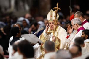 The pope’s Mass began with him blessing with holy water the candles used for the entrance procession, praying that the people of God “may join the light that has no end.” Some 50 consecrated men and women led the candlelit procession while the lights in St. Peter’s Basilica remained dimmed, and many of the 5,000 people that filled the basilica held lit candles as well.