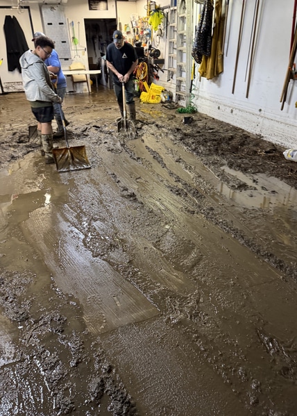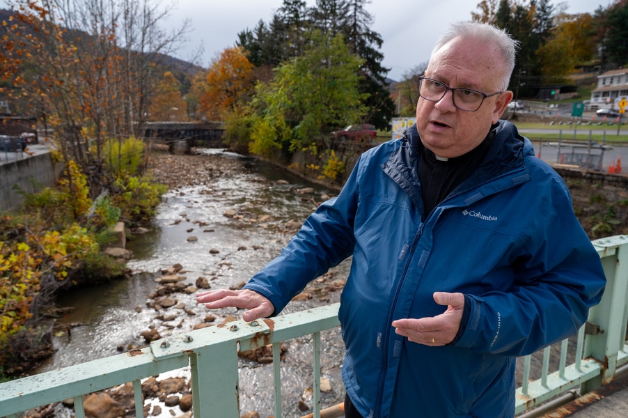 Westernport experiences a flood of relief January 5, 2026By Katie V. Jones Catholic Review Filed Under: Disaster Relief, Feature, Local News, News, Western Vicariate WESTERNPORT – Beloved antiques fill every room at Boal Funeral Home, but everything else is brand new, from the floors to the freshly painted ceiling. On a reconfigured sitting-room wall, a series of photographs tells why the 122-year-old business, on Church Street since 1937, has a new look. It is a story familiar to many in Westernport: a story of nature’s power, resilience, faith and community. Heavy rains May 13 caused Georges Creek to overflow its banks, while the Potomac River was too full to accept the creek’s flow. Within minutes, water rushed down Church Street, flooding everything in its path. Father Scott Kady, pastor of Divine Mercy Parish – St. Peter Church in Westernport, Cumberland, stands on a bridge over what is now a calm Georges Creek, sharing his account of the May storm that dumped a foot of rain on his community. (Kevin J. Parks/CR Staff) “I was trapped inside of here,” said Theresa Boal, a parishioner of St. Peter in Westernport and owner of the funeral home, recalling that fateful day. “There was no time to do anything.” Just a few houses down, Martha McConnell was working with another parishioner inside St. Peter’s rectory, part of Divine Mercy Parish in Frostburg, when she noticed the creek cresting. “We just got out of here in time,” McConnell said. “I bet it wasn’t 15 to 20 minutes later it flooded.” Floodwaters broke through the basements of both the church and rectory, damaging everything, including boilers and furnaces. At Boal’s business, water rushed in the back door, filled every room, and spilled onto the street. “We spent days pulling mud out of here,” Boal said, in early November. “It happened the 13th. By the 16th, this place was gutted and dry. I had the first service here last week.” Help poured in from across the region. Father Scott Kady, pastor of Divine Mercy, saw license plates from five states among volunteers of all faiths – Catholics, Mennonites and more – pitching in. “It really showed me how the words of Jesus pertain to the present,” Father Kady said. “Love your neighbor as yourself.” During the flood, St. Peter’s parking lot sheltered several people until they could get inside the church. Afterward, the lot served as a staging area for gas companies and other relief efforts. Neighbors and volunteers came together to assist Theresa Boal, owner of Boal Funeral Home in Cumberland, after a severe flood caused major damage to her business following a one-foot rainfall and flash flood from a May storm. Georges Creek, which sits next to the funeral home, overflowed more than 10 feet above the flood wall with reports indicating areas of Westernport were left with as much as a foot of mud due to the rushing water. (Courtesy of Theresa Boal) “People had no gas, no water,” Father Kady said. “Lowe’s and Walmart donated shovels and boots – everything to help clean up.” The Archdiocese of Baltimore contributed $194,427 through a special appeal to support recovery. “With all that money that came in, it was just amazing. We were able to help 157 people,” Father Kady said. The church partnered with Allegany County Human Services to distribute the funds efficiently. “They had systems in place (that) we didn’t, to distribute the money,” he said. “Insurance covered the damage to our three properties.” Other parish properties also suffered. St. Gabriel in Barton, part of Divine Mercy, had its basement – the church’s social hall – flooded. Boal’s second funeral home location in Barton, even closer to Georges Creek, escaped damage. The photos on the Westernport wall show the floodwaters racing down Church Street, the mud, the destruction and the people who came to help clean up. Boal said she’s grateful to the many volunteers who helped that day and in the days that followed. While she was trapped in her business May 13, Boal’s son was stuck at the elementary school. Later, the smell of gas prompted a boat evacuation of everyone. “The crazy thing is, my faith in God, I promise you, it changed a lot,” Boal said, her voice filled with emotion. “Because, I thought, ‘No one died.’ That’s amazing.” A river runs through it In the rectory of St. Peter in Westernport, an undated photo begs for a story. It shows the 1873 church standing just steps from the North Branch of the Potomac River. Today, Church Street runs beside the church, while the river flows behind the homes across the street. How and when the river moved remains a mystery. Father Scott Kady, a Westernport native and pastor of Divine Mercy in Frostburg (the pastorate that includes St. Peter), recalled hearing growing up that those homes sat on a natural island dividing the river in front of the church. It is said the owners of West Virginia Pulp and Paper Mill redirected the river because they wanted their mill on the Maryland side, not in West Virginia. The mill, most recently Verso Paper Co., closed in May 2019. The Potomac River belongs entirely to the state of Maryland, forming the boundary with West Virginia. Father Edward Hendricks, pastor of Divine Mercy from 2016 to 2023, first heard stories of the river’s relocation when he served as associate pastor at St. Peter from 1977 to 1981. Now retired, he believes the river was moved in the late 1800s or early 1900s, though he knows no specifics. A Westvaco Corporation entry on encyclopedia.com notes that the river shifted, placing the company in Luke, Md., but gives no explanation. An AI review suggested erosion and uplift pushed the river south. Dave Mock, second vice president of the Westernport Heritage Society, is confident the river’s movement “was definitely done by the mill or some other entity in the late 1800s early 1900s,” though he concedes the mill’s involvement ma