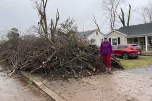 “Every house around here was hit — some worse than others — but we had no deaths, and you can see by the photos how the downed tree roots tower 5 to 6 feet over our heads,” said Durbin.