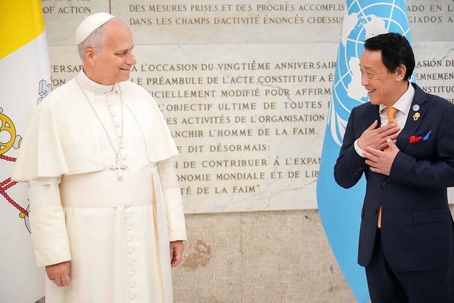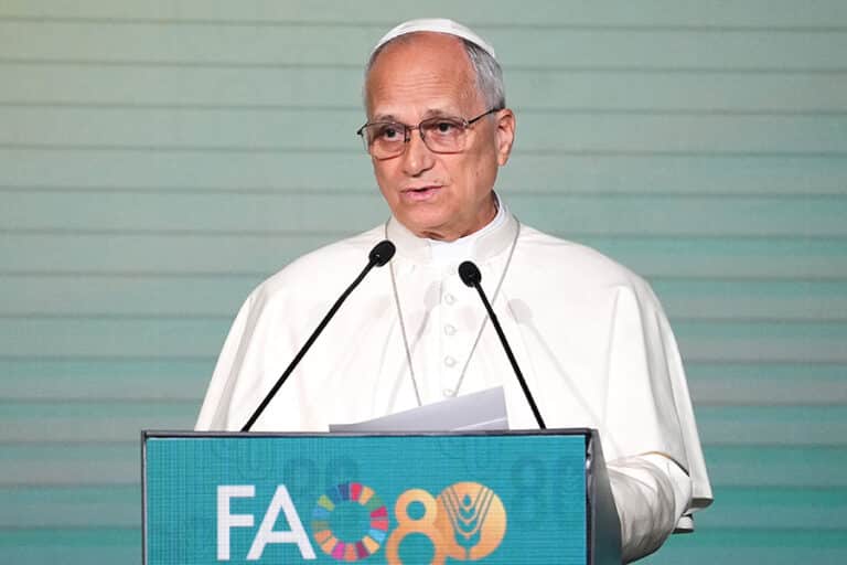 World hunger is ‘collective failure,’ pope says on World Food Day October 16, 2025By Cindy Wooden Catholic News Service Filed Under: News, Vatican, World News ROME (CNS) — “Allowing millions of human beings to live — and die — as victims of hunger is a collective failure, an ethical aberration, a historical fault,” Pope Leo XIV said on World Food Day. The pope drove across Rome Oct. 16 to address world leaders and government representatives at the headquarters of the U.N. Food and Agriculture Organization. In addition to marking World Food Day, the delegates were celebrating the 80th anniversary of FAO’s establishment. In his speech, Pope Leo decried the fact that while humanity has made huge advances in technology, medicine, agriculture and transportation, 673 million people go to bed hungry each night, and 2.3 billion people cannot afford a healthy diet. Pope Leo XIV greets Qu Dongyu, director-general of the U.N. Food and Agriculture Organization, before addressing government leaders during a ceremony marking the agency’s 80th anniversary at its headquarters in Rome Oct. 16, 2025. (CNS photo/Lola Gomez) The FAO statistics are not just numbers, he said; “behind each of these numbers is a broken life, a vulnerable community.” “This is not a coincidence, but the clear sign of a prevailing insensitivity, of a soulless economy, of a questionable model of development, and of an unjust and unsustainable system of resource distribution,” Pope Leo insisted. Perhaps referring to the situation in Gaza, but also to other war zones, the pope said that “current conflict scenarios have brought back the use of food as a weapon of war.” A global conviction that “deliberate starvation as well as the intentional obstruction of access to food for communities or entire peoples, constitutes a war crime” seems to be slipping away, he said. The “cruel strategy” of using food as a weapon of war, the pope said, “condemns men, women and children to hunger by denying them the most basic right: the right to life.” While governments have an obvious role in addressing hunger, Pope Leo said no one can consider the problem to be someone else’s responsibility. “Those who suffer from hunger are not strangers,” he said. “They are my brothers and sisters, and I must help them without delay.” Hunger “is a cry rising to heaven, demanding a swift response from every nation, from every international body, from every regional, local or private entity,” he said. “It is a battle that belongs to us all.” “How can we explain the inequalities that allow a few to have everything, while so many have nothing?” Pope Leo asked. And, he said, “How can we fail to remember all of those who are condemned to death and hardship in Ukraine, Gaza, Haiti, Afghanistan, Mali, the Central African Republic, Yemen and South Sudan, to name just a few places on the planet where poverty has become the daily bread of so many of our brothers and sisters?” No individual or government can look the other way, the pope said. “We must make their suffering our own.” “We cannot aspire to a more just social life if we are not willing to rid ourselves of the apathy that justifies hunger as if it were background music we have grown accustomed to,” the pope said. Failure to act, even for individuals, he said, is to be “complicit in the promotion of injustice.” “We cannot hope for a better world, a bright and peaceful future, if we are not willing to share what we ourselves have received,” Pope Leo said. “Only then can we affirm — with truth and courage — that no one has been left behind.” Read More Vatican News Pope arrives in Turkey giving thanks, preaching peace Lebanese long for peace ahead of Pope Leo’s visit Vatican reports surplus in 2024 with asset sales, increased donations Gratitude should accompany your turkey and pie, pope says Generating life requires having hope in life’s meaning, pope said Marriage is an exclusive union requiring ‘tender care,’ Vatican says Copyright © 2025 Catholic News Service/U.S. Conference of Catholic Bishops Print