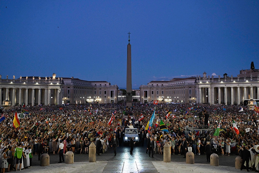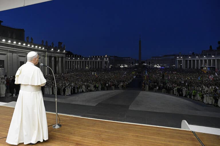 World will hear young people’s joy, shouting for peace on earth, pope says July 30, 2025By Carol Glatz OSV News Filed Under: Feature, Jubilee 2025, News, Vatican, World News The enthusiastic joy of young people, who love Jesus and want all wars to stop, will be heard to the ends of the earth, Pope Leo XIV said, welcoming tens of thousands of cheering young men and women to Rome for their Jubilee. “Buona sera, buenas tardes, good evening!” he said after finishing a long ride in the popemobile, waving to more than 120,000 ecstatic visitors filling St. Peter’s Square and the long, wide boulevard that runs between the square and Castel Sant’Angelo by the Tiber River. The pope appeared at the end of a Mass presided over by Archbishop Rino Fisichella in St. Peter’s Square July 29 as part of a series of welcome celebrations for the weeklong Jubilee of Youth. Pope Leo XIV greets visitors and pilgrims in St. Peter’s Square at the conclusion of an evening Mass celebrated by Archbishop Rino Fisichella, pro-prefect of the Dicastery for Evanglization, as part of the Jubilee of Youth at the Vatican July 29, 2025. (CNS photo/Vatican Media) A rainbow of colors covered the streets and squares as different pilgrim groups wore coordinated colored T-shirts or hats, and scores of national flags billowed in the gusting evening wind. “Jesus tells us you are the salt of the earth. You are the light of the world,” Pope Leo said in English. “And today, your voices, your enthusiasm, your cheers, which are all for Jesus Christ, will be heard until the ends of the earth,” he said in Spanish to huge cheers. “Today marks the beginning of a journey, the Jubilee of Hope, and the world needs messages of hope. You are this message, and you must continue to give hope to everyone,” he said. “Let us walk together with our faith in Jesus Christ,” he said in Italian. “And our shouts must also be for peace in the world.” “Let’s all say it: We want peace in the world!” he shouted, as the crowd responded, “We want peace in the world.” “Let us pray for peace” and be witnesses to “the peace of Jesus Christ, the light of the world that we are all seeking,” he said, as the evening twilight turned to night and the waxing crescent moon appeared brightly. It was Pope Leo’s second “surprise” appearance July 29, after arriving to greet the faithful at the end of a morning Mass presided over by Cardinal Luis Antonio Tagle, marking the conclusion of the Jubilee of Digital Missionaries and Catholic Influencers July 28-29. The pope was scheduled to lead his weekly general audience in St. Peter’s Square July 30, and then lead an evening prayer vigil Aug. 2 and morning Mass Aug. 3 in Rome’s Tor Vergata neighborhood, where close to 1 million young people were expected. Pope Leo XIV greets visitors and pilgrims from the popemobile as he rides through St. Peter’s Square at the conclusion of an evening Mass celebrated by Archbishop Rino Fisichella, pro-prefect of the Dicastery for Evanglization, as part of the Jubilee of Youth at the Vatican July 29, 2025. (CNS photo/Vatican Media) Cardinal Tagle and Archbishop Fisichella lead the two sections making up the Dicastery for Evangelization as pro-prefects. The archbishop’s section has been in charge of organizing the Holy Year. Before celebrating the evening Mass in the square July 29, Archbishop Fisichella welcomed the young people on behalf of the pope, especially those who came from war-torn regions. “May the fraternal embrace that unites us as one body reach those from Ukraine and Palestine and other countries,” he said. Two young men from Palestine wore the traditional keffiyeh, a wide scarf, over their shoulders during the Mass as they brought up the offertory gifts. “Make sure to show them a sign of your friendship,” the archbishop said in his greeting before Mass. To those who had to make many sacrifices to come to Rome, he said, “The Lord will not disappoint you. He comes to meet you — remain vigilant so that you may recognize his presence in your life.” “Live these days with joy and spirituality, discovering new friendships,” and enjoying the city of Rome, he said. “We are here to hand on the faith and to understand the great value that Jesus Christ brings into our lives. Let us respond with enthusiasm in these days: Rome, with all that it represents, is in your hands,” Archbishop Fisichella said. Read More Vatican News Pope says US-European alliance needs to be strong Live authentically with prayer, letting go of the unnecessary, pope says Indigenous artifacts from Vatican welcomed home to Canada in Montreal ceremony Vatican yearbook goes online A steady light: Pope Leo XIV’s top five moments of 2025 Dialogue, diplomacy can lead to just, lasting peace in Ukraine, pope says Copyright © 2025 OSV News Print