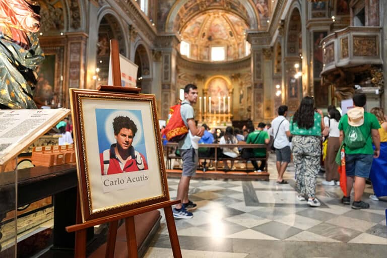 Young teen’s relics a reminder for pilgrims that holiness ‘is not impossible’ August 1, 2025By Junno Arocho Esteves Catholic News Service Filed Under: Feature, Jubilee 2025, News, Saints, Vatican, World News ROME — Along one of Rome’s busiest streets, Via del Corso, traffic moves slowly as hundreds of pilgrims crisscross traffic on foot to get to their destination. Amid the mayhem stands the Church of San Marcello al Corso, a small church built in the late 17th century that also houses several relics, including one of the True Cross. However, on the occasion of the Jubilee of Youth, the church became the temporary home of a first-class relic of Blessed Carlo Acutis, who will become the Catholic Church’s first millennial saint in September. From left, John Paul Mirabel from Winnipeg, Canada, and Kieran Bray from Halifax, Canada, both members of Catholic Christian Outreach, pose for a photo outside the Church of San Marcello al Corso in Rome July 31, 2025, where the relics of Blessed Carlo Acutis are displayed during the Jubilee of Youth. The Canadian movement is dedicated to campus ministry and evangelization. (CNS photo/Lola Gomez) A steady stream of pilgrims entered the church July 31, signing prayer intention cards and kneeling in silent prayer in front of the Blessed Sacrament. To the left of the main altar was a small table bearing a golden reliquary housing a section Acutis’ pericardium, a membrane that surrounds the heart. The display of the relic in Rome from July 29-31 was organized by Catholic Christian Outreach (CCO), a Canadian Catholic movement dedicated to campus ministry and evangelization. During the Jubilee of Youth, CCO hosted the relic at San Marcello al Corso as part of its “Young Saints — A pilgrimage in Rome” program. The flow of visitors and curious onlookers viewing the relics was due in part to volunteers inviting people walking along Via del Corso to visit the church. Donning gray shirts bearing the CCO logo, Canadian volunteers Kieran Bray of Halifax and John Paul Mirabel of Winnipeg handed out to those passing by tiny pamphlets on building a relationship with Jesus. “We’re a campus-based movement that aims to invite (people), students especially, to have Christ at the center of their life,” Mirabel told Catholic News Service July 31. “We’re here together for a mission to Rome, so we’ve gathered from all the campuses across Canada to invite people here in Rome in the Jubilee season to invite Christ to the center of their life.” Bray said that Blessed Acutis is “very attractive to young people in the faith” and that they “really feel connected to him because he’s someone (with whom) they can really relate.” Before his death from leukemia in 2006, Acutis was just a normal teenager with a knack for computers who put that knowledge to use by creating an online database of Eucharistic miracles around the world. In his apostolic exhortation on young people, “Christus Vivit” (“Christ Lives”), the late Pope Francis said the teen was a role model for young people today who are often tempted by the traps of “self-absorption, isolation and empty pleasure.” Religious sisters pray before the relics of Blessed Carlo Acutis at the Church of San Marcello al Corso in Rome July 31, 2025. (CNS photo/Lola Gomez) “Carlo was well-aware that the whole apparatus of communications, advertising and social networking can be used to lull us, to make us addicted to consumerism and buying the latest thing on the market, obsessed with our free time, caught up in negativity,” the pope wrote. “Having the relic here, I feel like it has attracted lots of young people in the faith and people who are interested,” Bray added. “He’s really someone that we can look to and be like, ‘OK, we can be like this guy, right?'” Mirabel told CNS that while he believes “Carlo would be so happy” seeing people flocking to the church temporarily housing his relics, he would be even happier knowing some people have become closer to the Eucharist because of him. “Sure, he is the attraction; he is the relic here in this church. But then, people are drawn to the Eucharist, and he points to the Eucharist. It’s just how his ministry was and his website with the Eucharistic miracles; just pointing everyone to Christ.” The Canadian volunteers told CNS they hope that through learning about the life of Blessed Acutis, visitors and pilgrims will learn that not only are they called to be saints, but that holiness is an achievable goal. “I’ve noticed that people are saying, ‘OK, maybe I can’t be like St. Francis of Assisi, who did all these crazy things back a thousand years ago,'” Bray said. “But Blessed Carlo only lived 34 years ago. “So, it’s like, ‘OK, we can do that!’ And sainthood, it’s not impossible!” Read More Jubilee 2025 Christian hope shows that the earth can resemble heaven, pope says Reflections on the synodal journey Catholics must build a more humble church, seeking truth together, pope says Cardinal McElroy urges ‘gratitude, compassion, shared purpose’ to heal national divisions More than 230 pilgrimages across the U.S. mark 10 years of ‘Laudato Si’ One can’t serve God and money, pope says on day he signs text on poverty Copyright © 2025 OSV News Print
